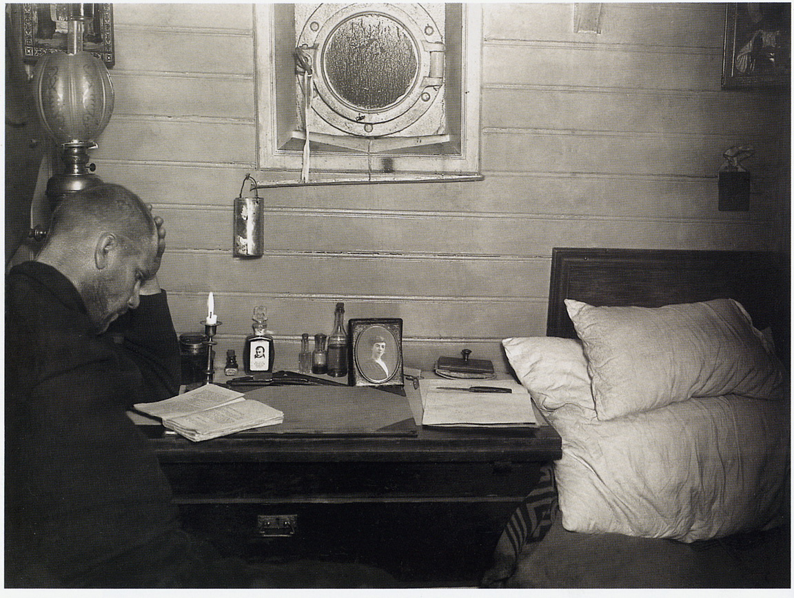Неизвестный автор. Георгий Седов читает в каюте судна "Святой мученик Фока" у берегов Новой Земли. Экспедиция к Северному полюсу, 1912