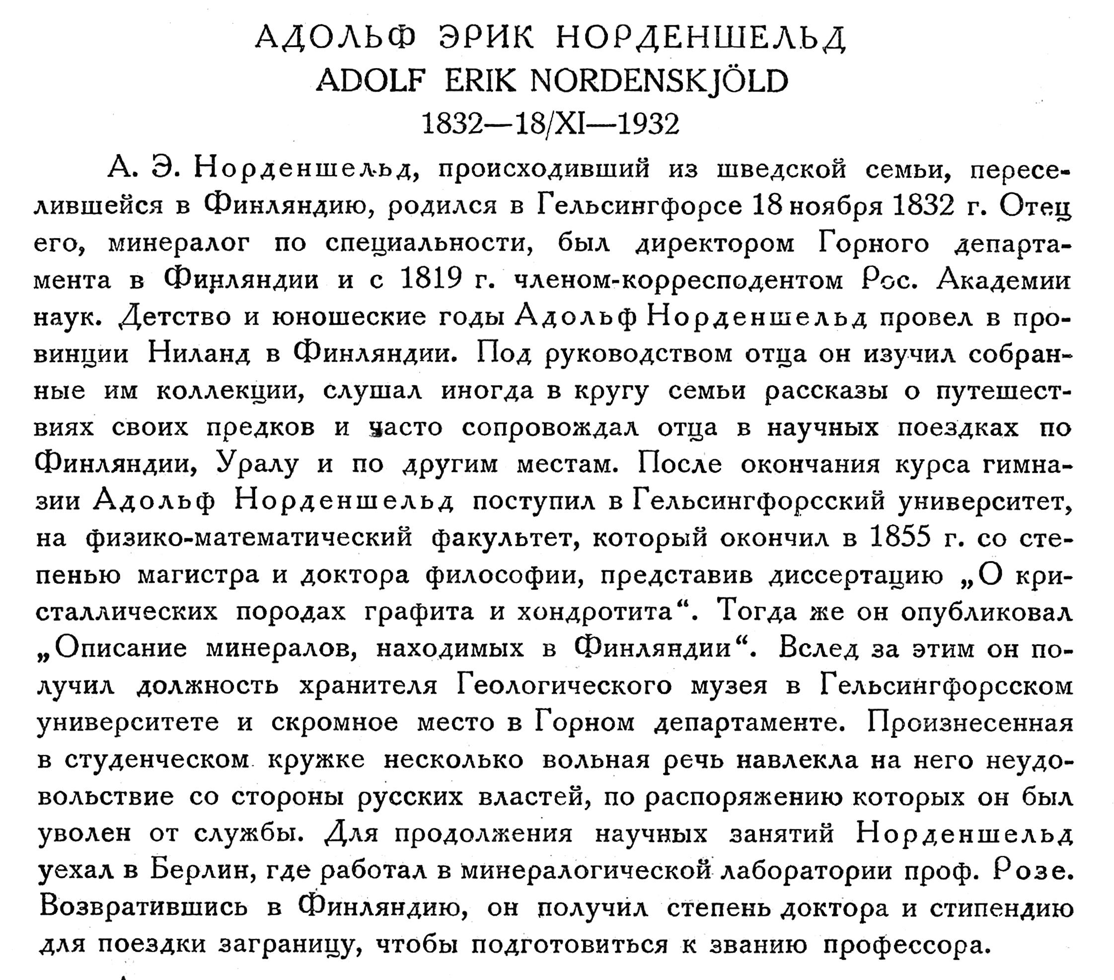 А. Э. Норденшельд, происходивший из шведской семьи, переселившейся в Финляндию, родился в Гельсингфорсе 18 ноября 1832 г. Отец его, минералог по специальности, был директором Горного департамента в Финляндии и с 1819 г. членом-корреспондентом Рос. Академии наук. Детство и юношеские годы Адольф Норденшельд провел в провинции Ниланд в Финляндии. Под руководством отца он изучил собранные им коллекции, слушал иногда в кругу семьи рассказы о путешествиях своих предков и часто сопровождал отца в научных поездках по Финляндии, Уралу и по другим местам. После окончания курса гимназии Адольф Норденшельд поступил в Гельсингфорсский университет, на физико-математический факультет, который окончил в 1855 г. со степенью магистра и доктора философии, представив диссертацию "О кристаллических породах графита и хондротита". Тогда же он опубликовал "Описание минералов, находимых в Финляндии". Вслед за этим он получил должность хранителя Геологического музея в Гельсингфорсском университете и скромное место в Горном департаменте. Произнесенная в студенческом кружке несколько вольная речь навлекла на него неудовольствие со стороны русских властей, по распоряжению которых он был уволен от службы. Для продолжения научных занятий Норденшельд уехал в Берлин, где работал в минералогической лаборатории проф. Розе. Возвратившись в Финляндию, он получил степень доктора и стипендию для поездки заграницу, чтобы подготовиться к званию профессора.