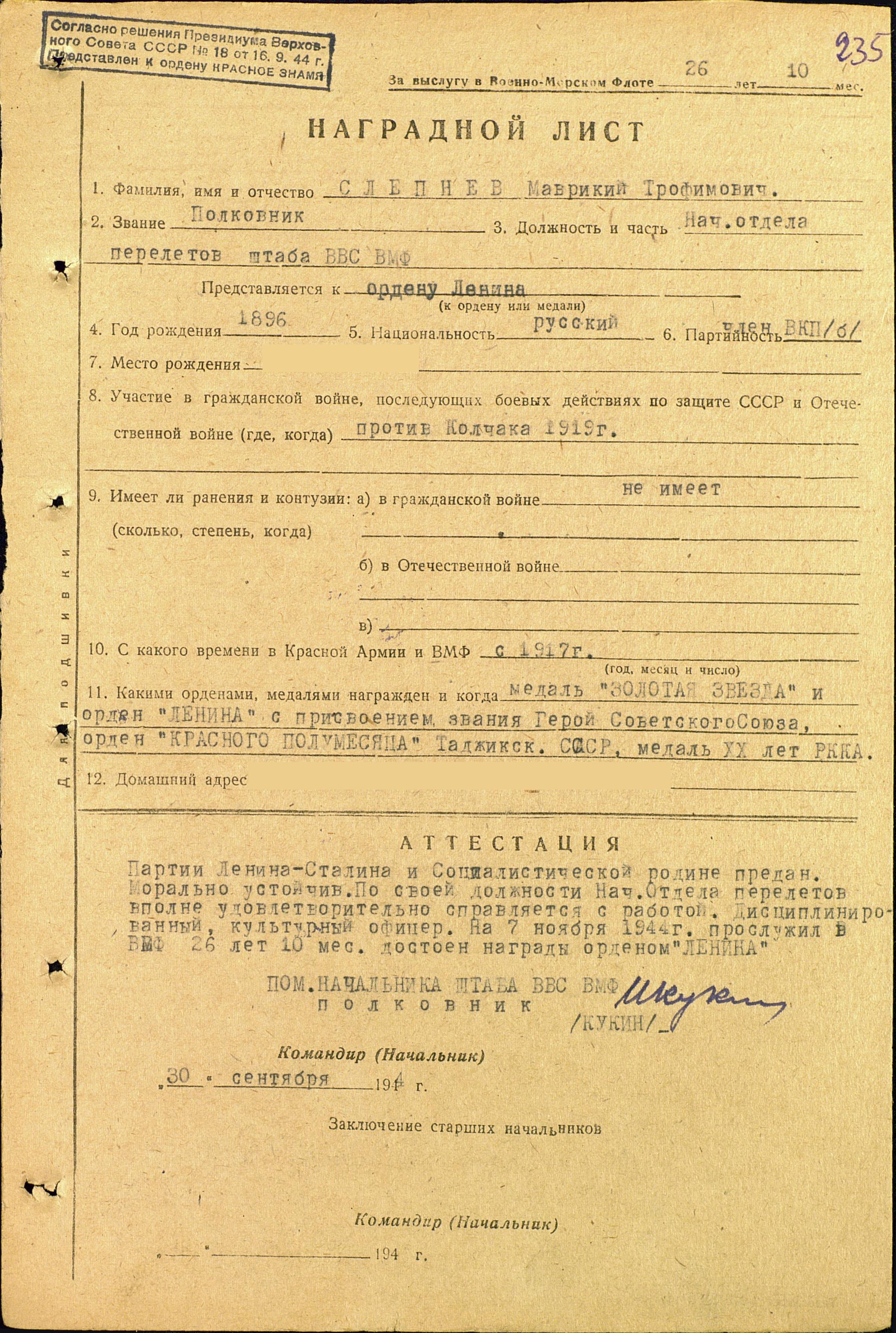 Наградной лист: фонд 3 опись 1 единица хранения 1144