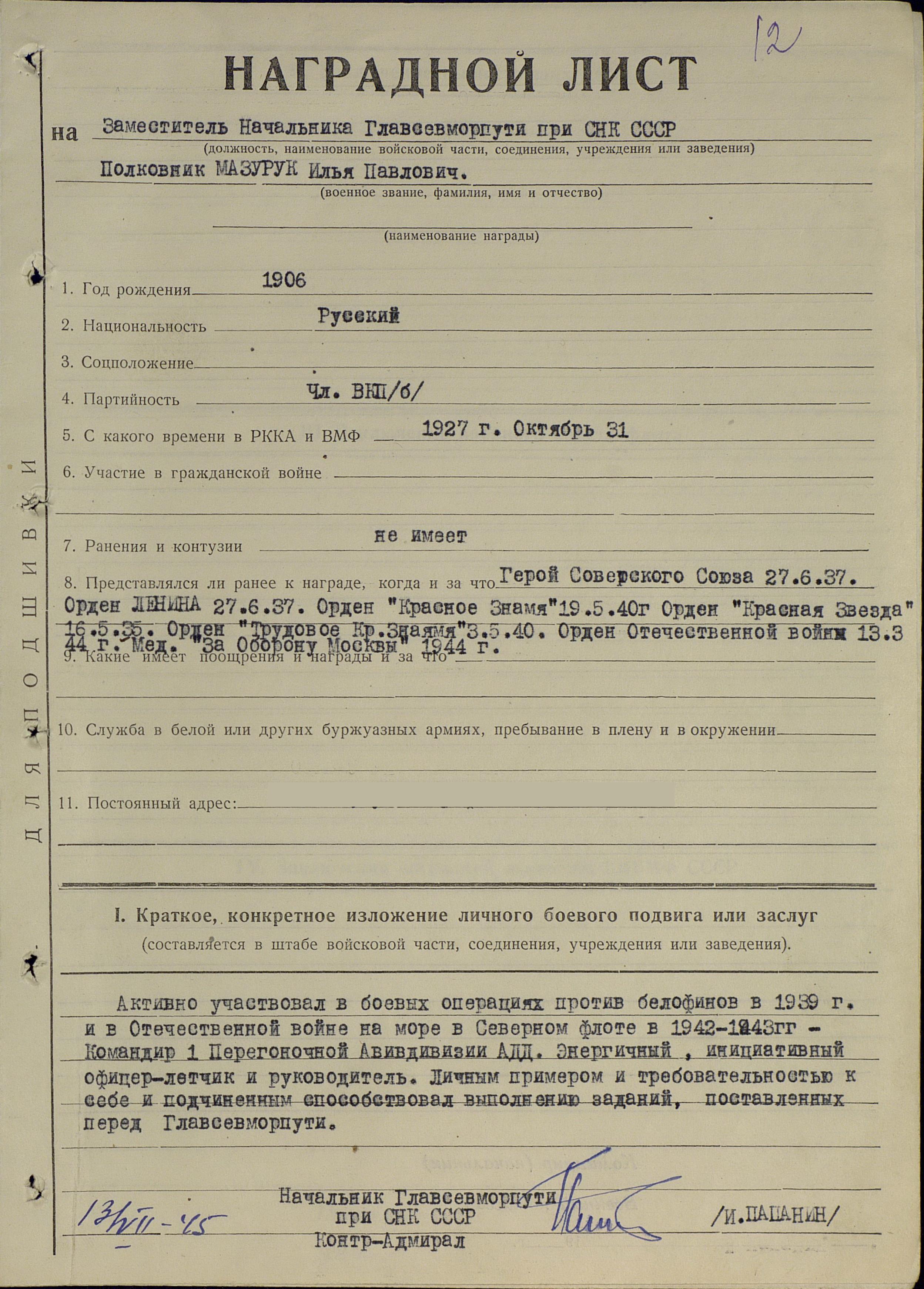 Вспоминается один из полетов, когда на борту дирижабля «Победа» с нами находился известный полярный летчик, Герой Советского Союза Илья Павлович Мазурук. Во время войны он продолжительное время участвовал в перегонке самолетов из США в район Владивостока и наблюдал у побережья американского континента много дирижаблей, успешно выполнявших патрульную службу. По его просьбе мы продемонстрировали некоторые уникальные качества дирижабля, — в полете изменяли скорость от нуля до максимальной, зависали над заданным местом, производили вертикальный взлет.
