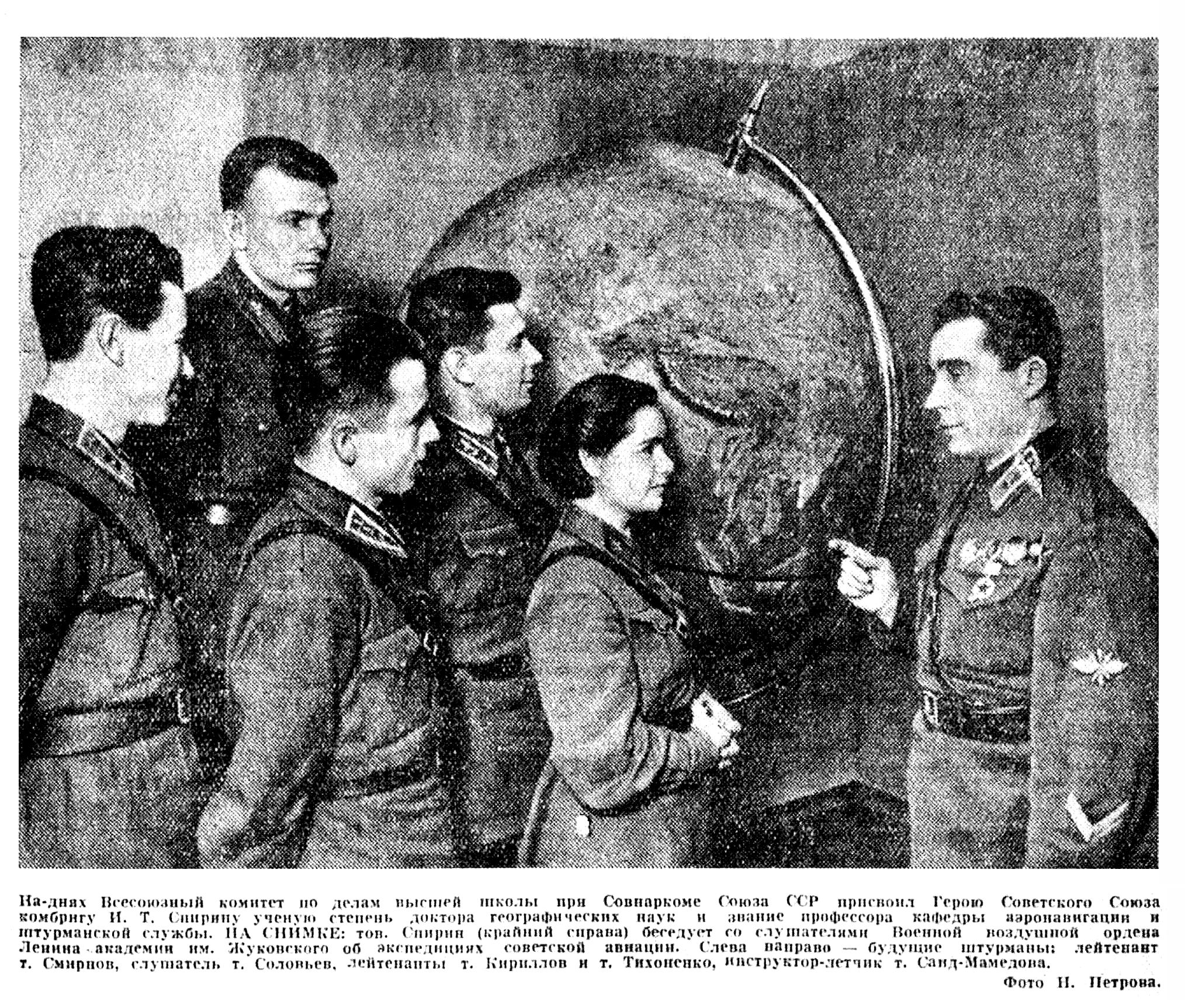 На-днях Всесоюзный комитет по делам высшей школы при Совнаркоме Союза ССР присвоил Герою Советского Союза комбригу И. Т. Спирину ученую степень доктора географических наук и звание профессора кафедры аэронавигации и штурманской службы. НА СНИМКЕ: тов. Спирин (крайний справа) беседует со слушателями Военной воздушной ордена Ленина академии им. Жуковского об экспедициях советской авиации. Слева направо — будущие штурманы: лейтенант т. Смирнов, слушатель т. Соловьев, лейтенанты т. Кириллов и т. Тихоненко, инструктор-летчик т. Саид-Мамедова.
