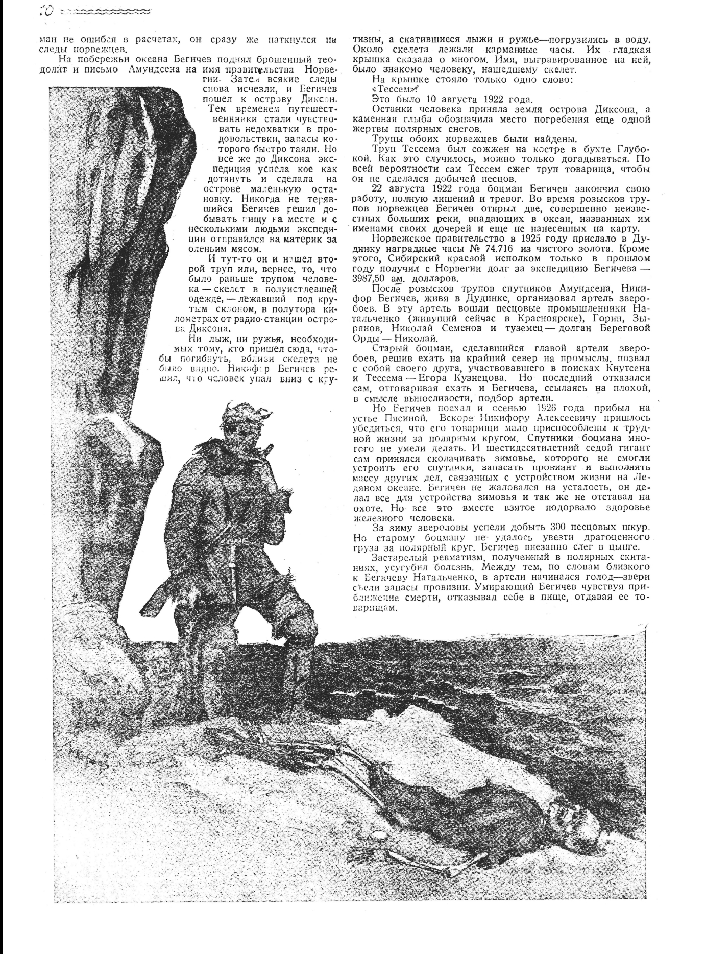 Дважды я обращался в красноярские краевые организации с просьбой заинтересоваться обстоятельствами смерти Бегичева, помочь установить, наконец, истину. Вмешался покойный ныне член-корреспондент АН СССР В. Ю. Визе. Президиум Всесоюзного географического общества, ознакомившись с материалами, направил письмо Красноярскому крайисполкому с просьбой о выделении средств для производства судебно-медицинской экспертизы, чтобы таким путем установить подлинную причину смерти Бегичева.