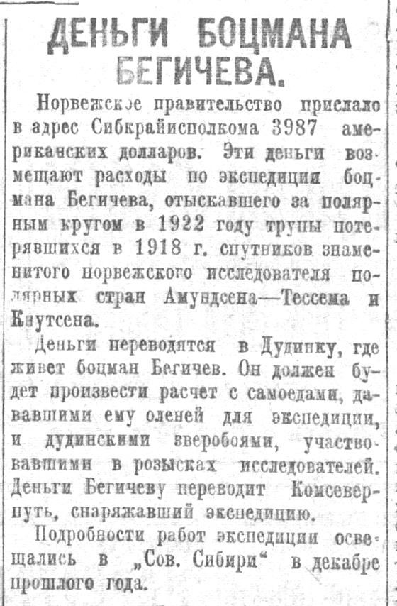 Бегичев был более чем уверен, что он нашел место гибели одного из норвежцев. Дошел до Пясины, но не встретил больше никаких следов. Наступившая осень заставила его вернуться в Дудинку. Но как только наступила весна, Бегичев вновь отправился на поиски, спустившись