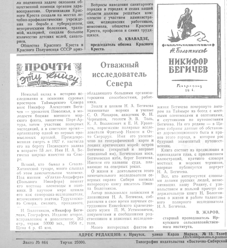 12. Болотников Н. На могиле Бегичева [Текст]: [статья из газеты "Литературная газета" (от 26 ноября 1955 г.) о выяснении причин смерти полярного исследователя Н. А. Бегичева] / Н. Болотников // Советский Таймыр. - 1955. - 3 декабря. - С. 4.