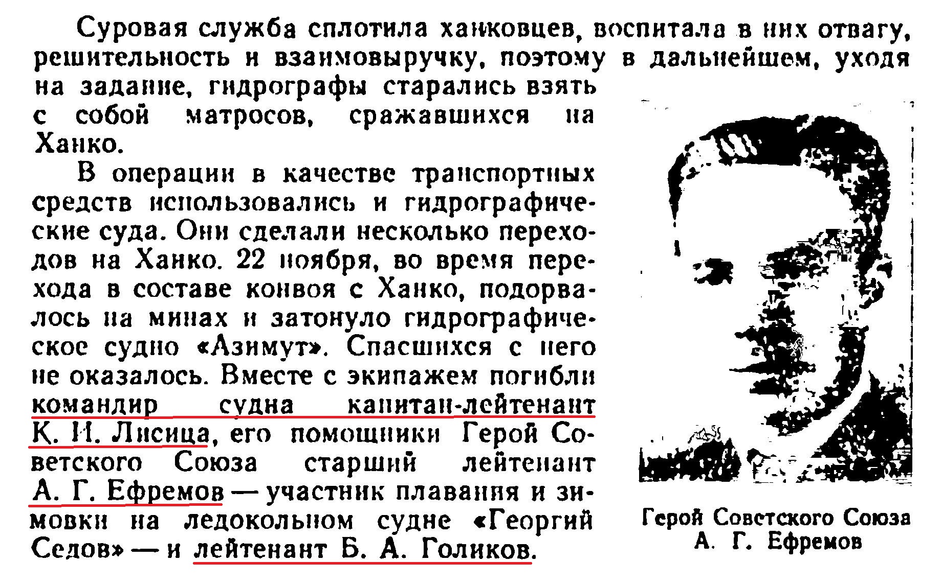 Гидрографы в Великой Отечественной Войне: 1941-1945: [сборник / редакционная коллегия: контр-адмирал П. Ф. Домрин и др. ]. - Ленинград: издательство Главного управления навигации и океанографии МО, 1975. - 440, [2] с., [6] л. схем.: ил., цв. ил.; 22 см.По информации из ОБД Мемориал они все погибли 18.11. 1941 г.