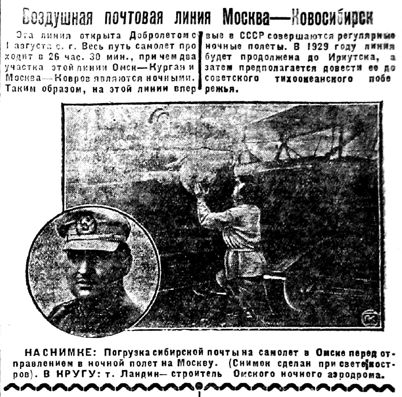 НА СНИМКЕ: Погрузка сибирской почты на самолет в Омске перед отправлением в ночной полет на Москву. (Снимок сделан при свете костров). В КРУГУ: т. Ландин—строитель Омского ночного аэродрома.