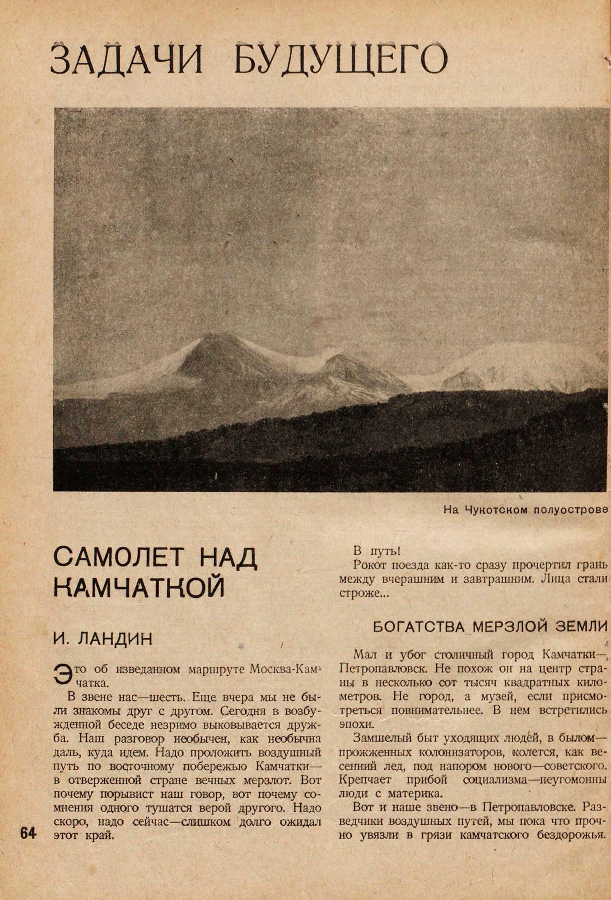 На крыльях самолета мы принесем камчатскому населению социалистическую культуру и через Берингов пролив братским народам Америки протянем дружескую руку.