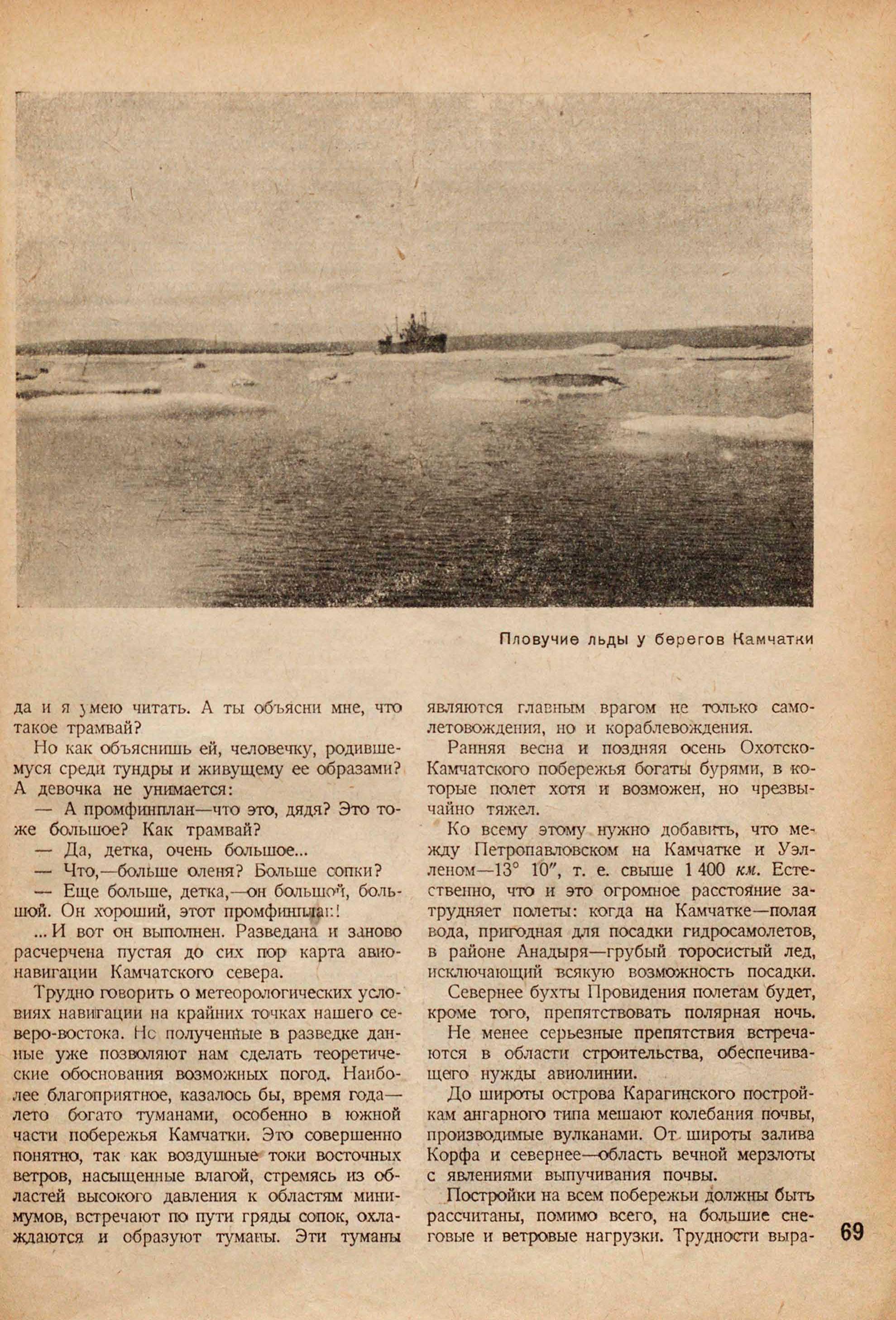 Все эти сведения, выявленные разведкой прошлого лета, ложатся в основу строительства новых авиолиний далекого севера-востока. Дело находится на новом, более высоком этапе. Скоро полетят самолеты над морем к мерзлым, но бесконечно богатым камчатским землям!