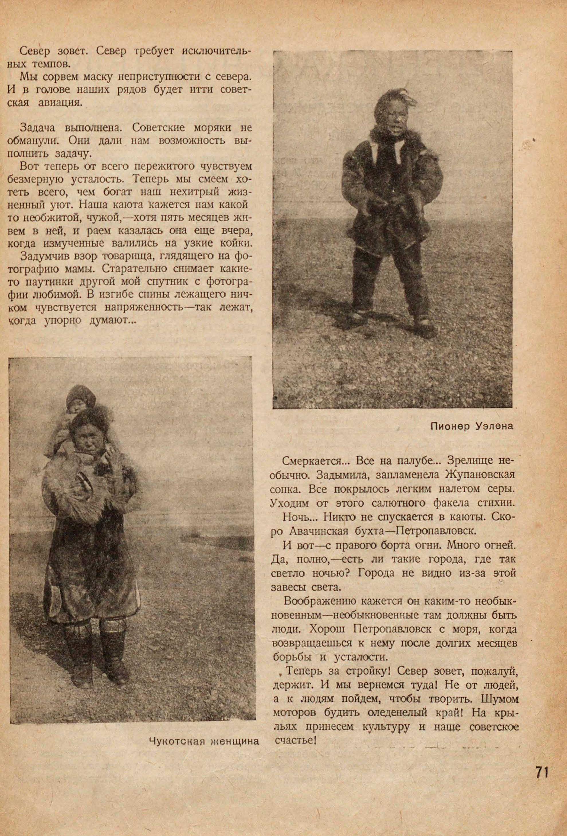 Убог, первобытен быт коренных жителей — этой человеческой основы края. И все же они преодолели и климат, и бездорожье, чтобы жить и не вымереть окончательно. Надо дать населению Камчатки совершенные орудия производства, нужно вооружить их технически, чтобы жизнь Камчатки слилась с жизнью всего Союза ССР.