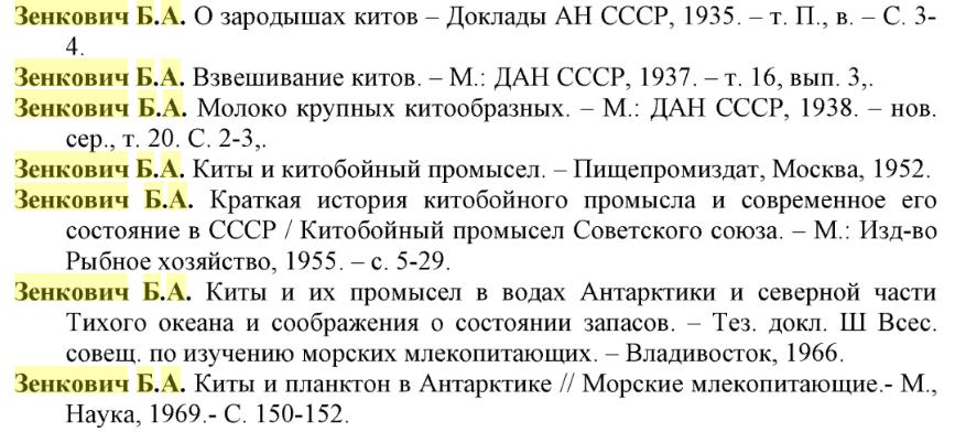 Вот список некоторых трудов Б. А. Зенковича. Из книги: Михалёв Ю. А. Киты Южного полушария: биология, промысел, перспективы восстановления популяций. Одесса, ООО «ИНВАЦ», 2008