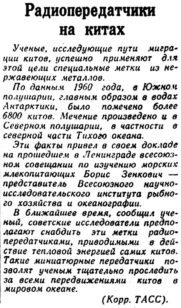 В ближайшее время, сообщил ученый, советские исследователи предполагают снабдить эти метки радиопередатчиками, приводимыми в действие тепловой энергией самих китов. Такие миниатюрные передатчики позволят ученым тщательно проследить за всеми передвижениями китов в мировом океане.