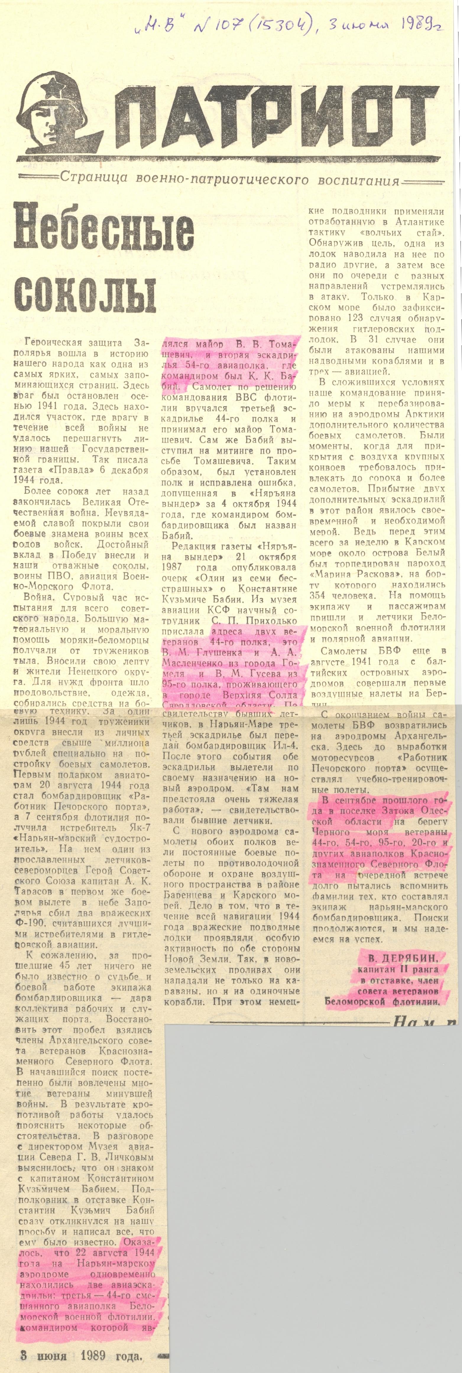 Редакция газеты «Няръяна вындер» 21 октября 1987 года опубликовала очерк «Один из семи бесстрашных» о Константине Кузьмиче Бабии. Из музея авиации КСФ научный сотрудник С. П. Приходько прислала адреса двух ветеранов 44-го полка, это В. М. Глушенка и А. А. Масленченко из города Гомеля и В. М. Гусева из 95-го полка, проживающего в городе Верхняя Солда Свердловской области. По свидетельству бывших летчиков, в Нарьян-Маре третьей эскадрилье был передан бомбардировщик Ил-4. После этого события обе эскадрильи вылетели по своему назначению на новый аэродром. «Там нам предстояла очень тяжелая работа», — свидетельствовали бывшие летчики.