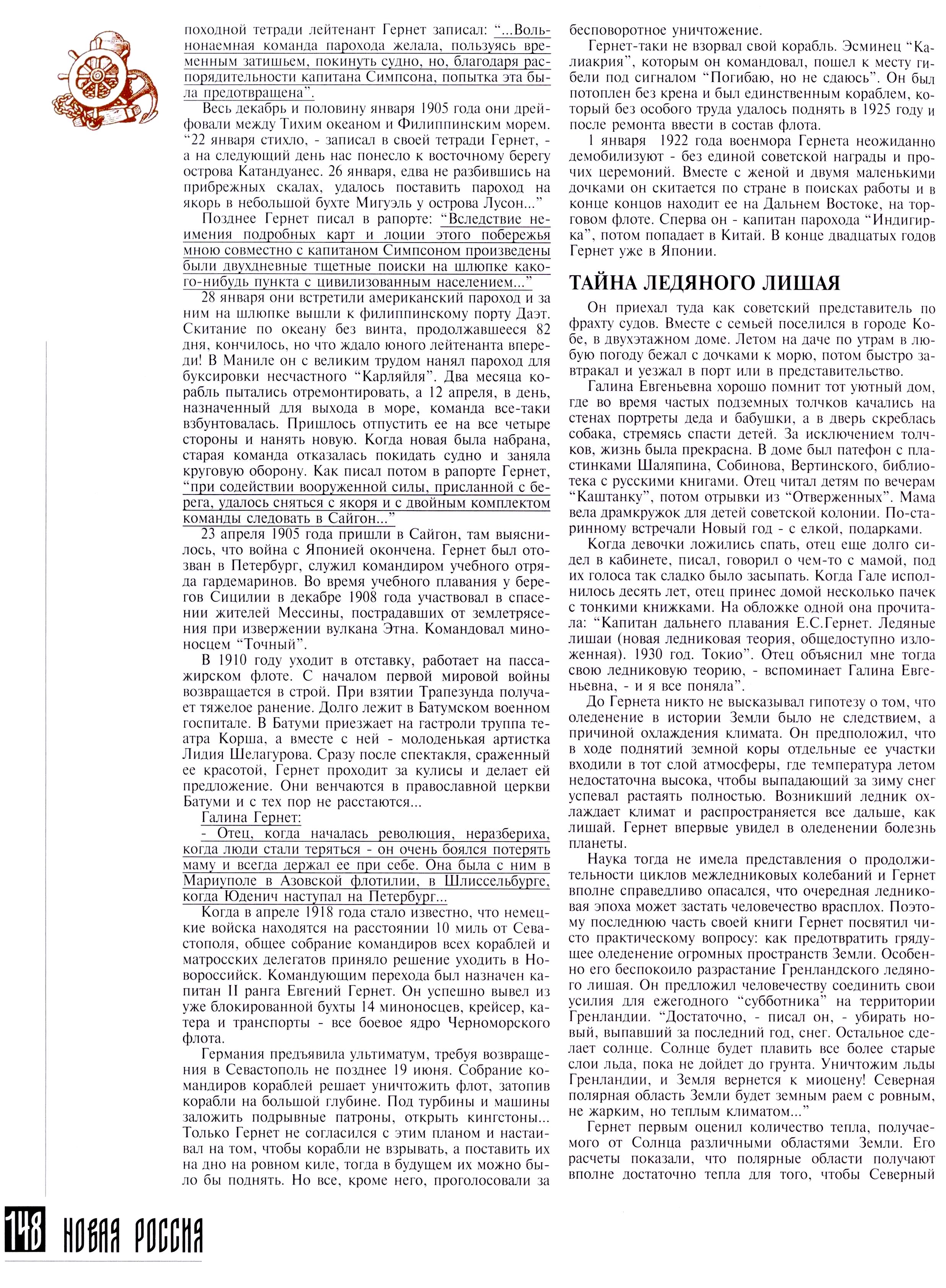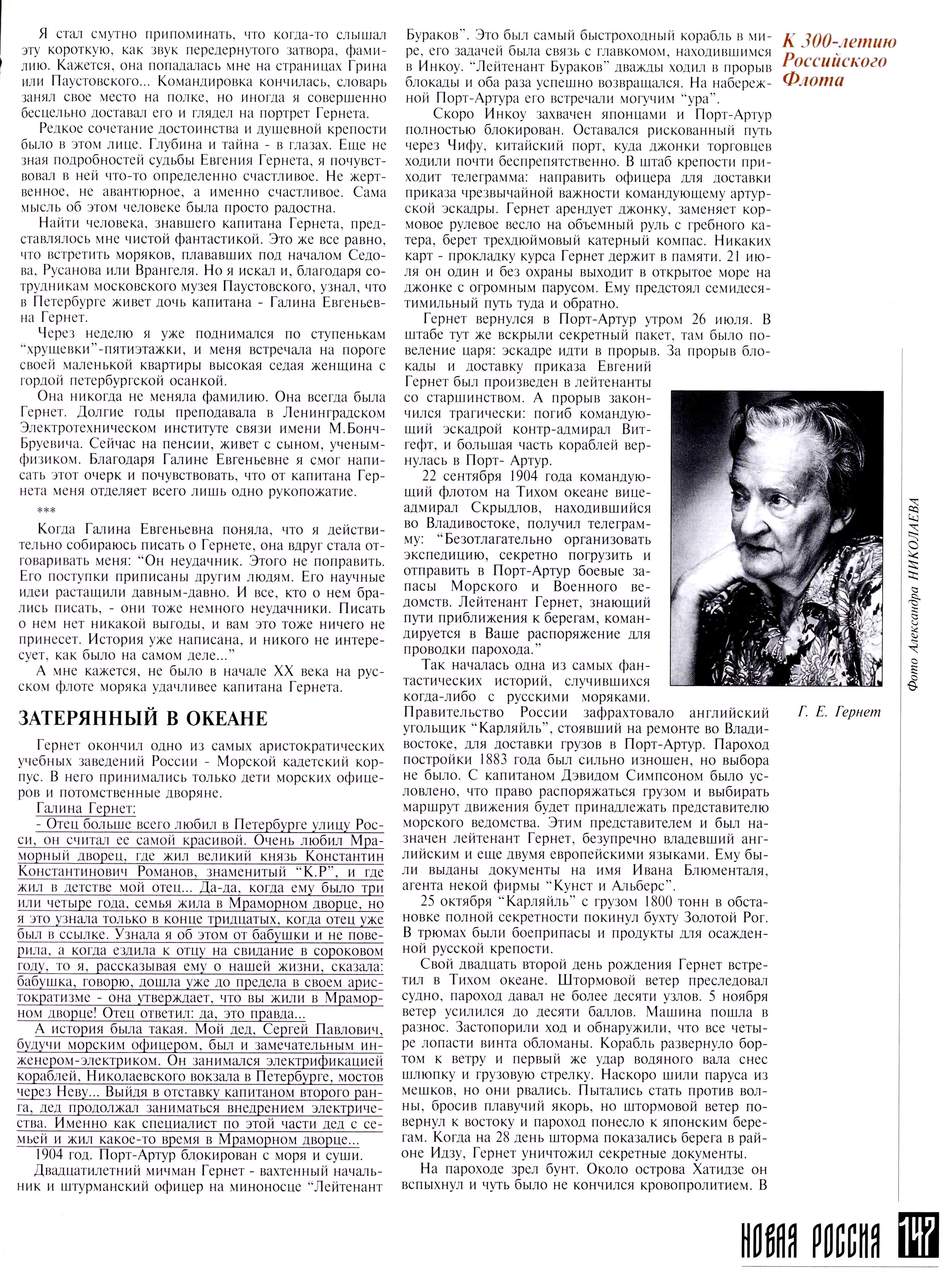 Кем же был Евгений Сергеевич Гернет? Биография его чрезвычайно яркая. Он происходил из старинного дворянского рода, получил блестящее образование, свободно говорил на трех европейских языках, мог объясниться по-японски. Окончил Морской кадетский корпус в Петербурге, участвовал в русско-японской войне. Показал себя человеком беспримерной храбрости. В мае 1904 года приказом адмирала С. О. Макарова был назначен штурманским офицером миноносца «Лейтенант Бураков», который четырежды прорывался через японскую блокаду, доставляя оперативные донесения в Инкоу. В июле 1904 года в одиночку на парусной джонке доставил в Чифу, что на другом берегу Бахайского пролива, секретные депеши...