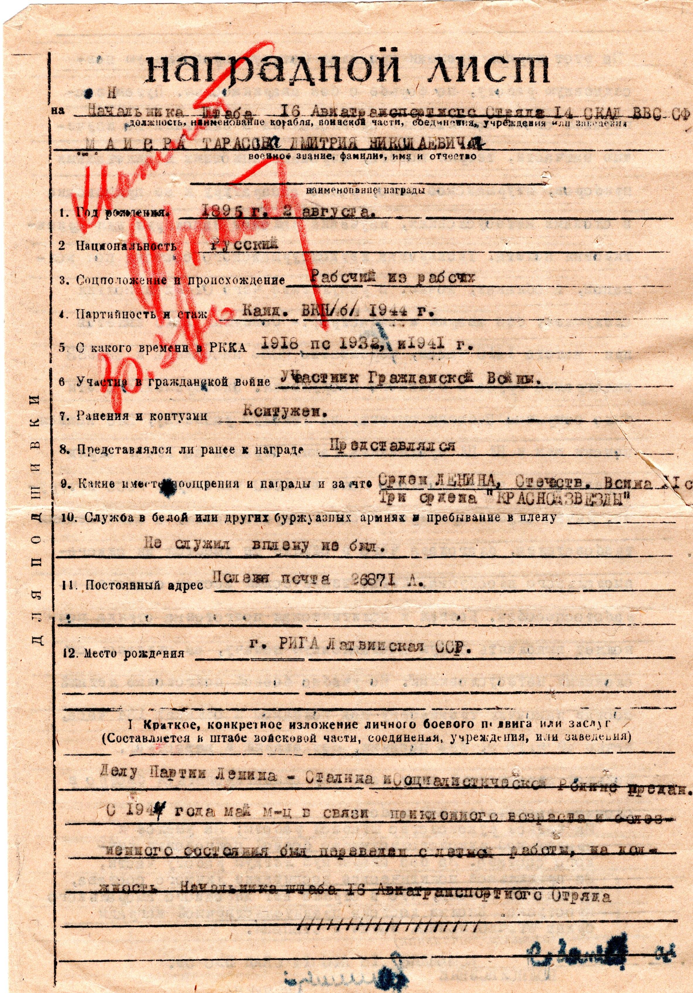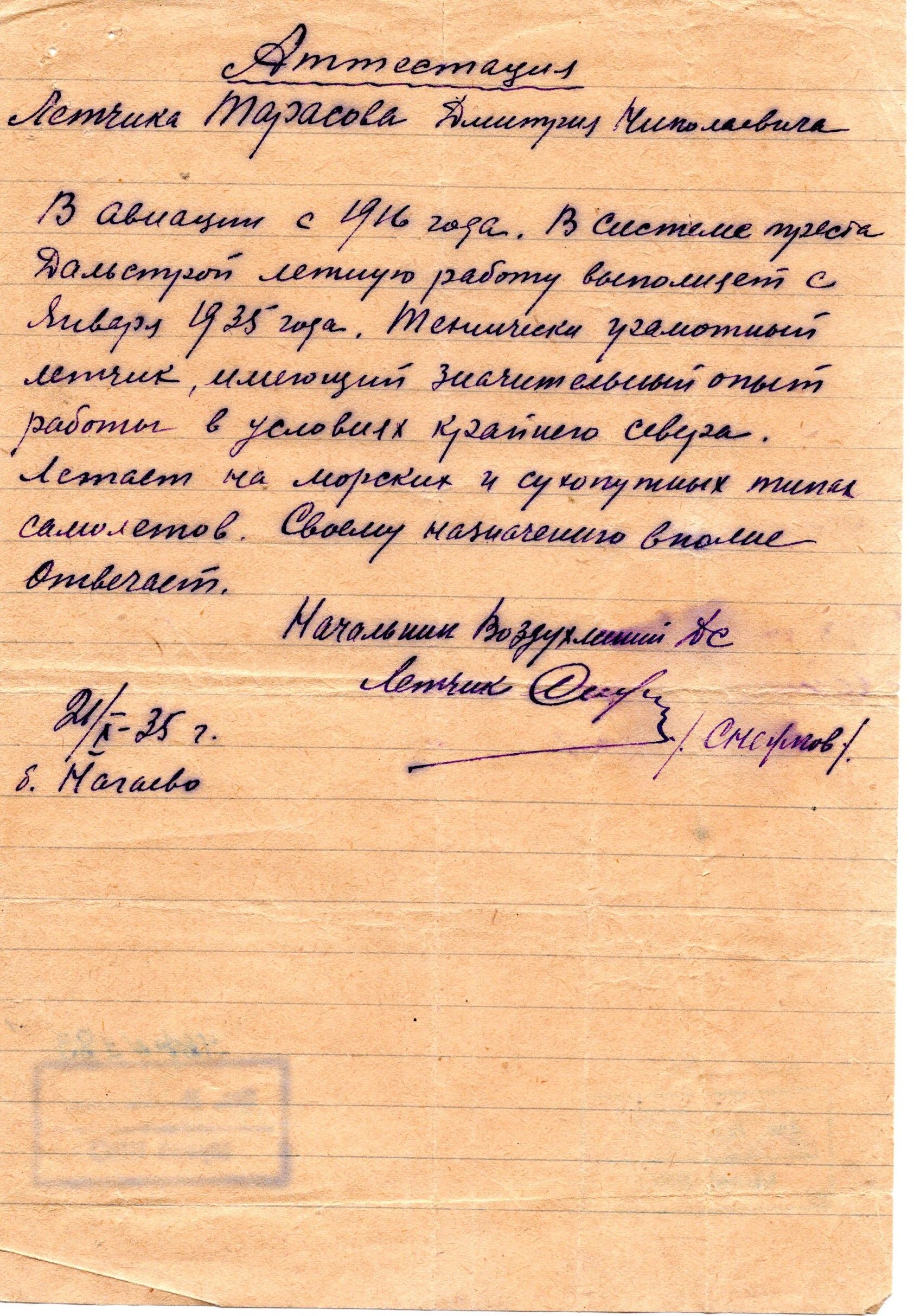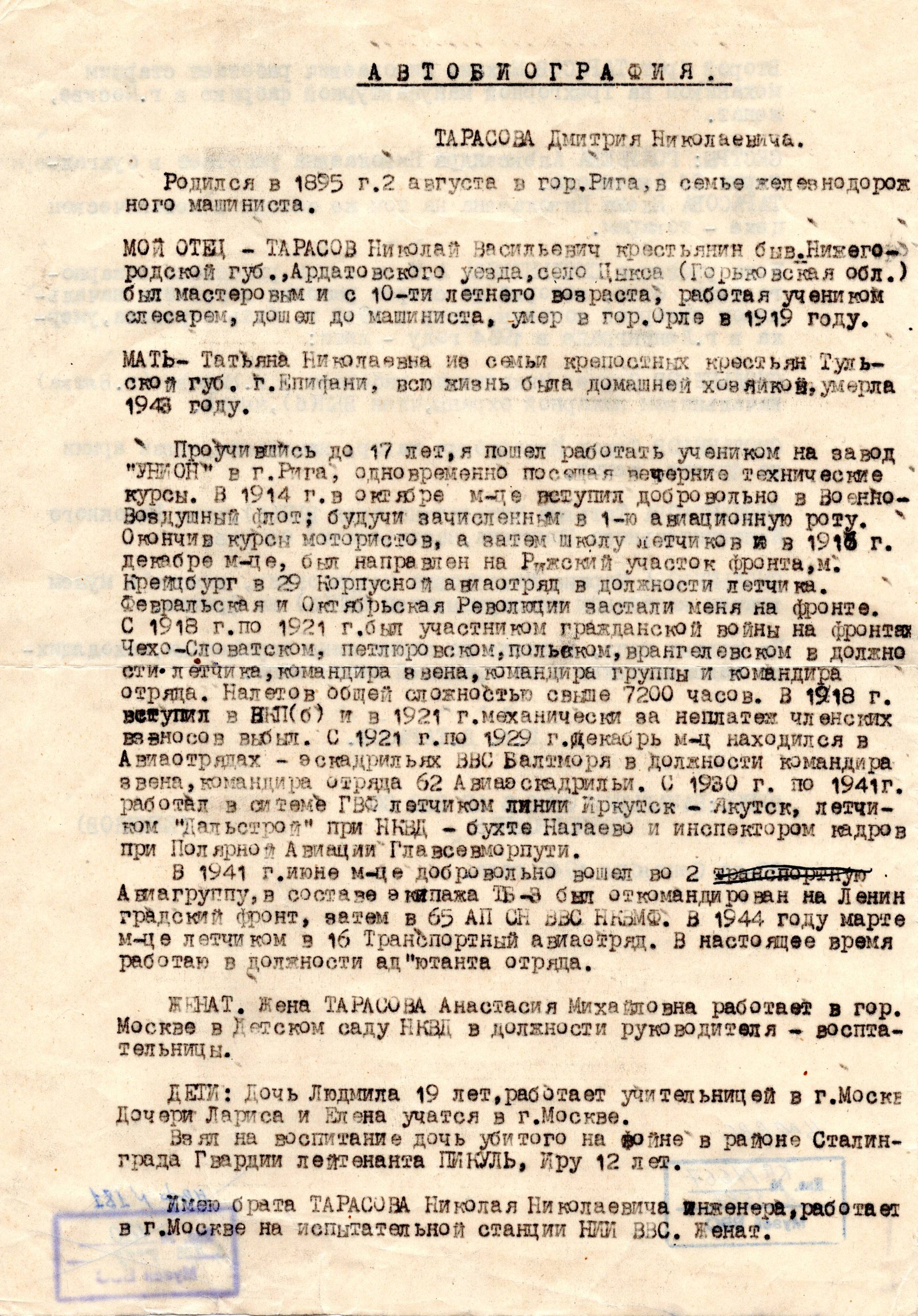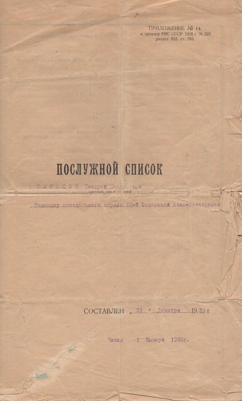 Послужной список командира неотдельного отряда 62-й отдельной авиаэскадрильи майора Тарасова Д.Н., составленный 31 декабря 1929 г.