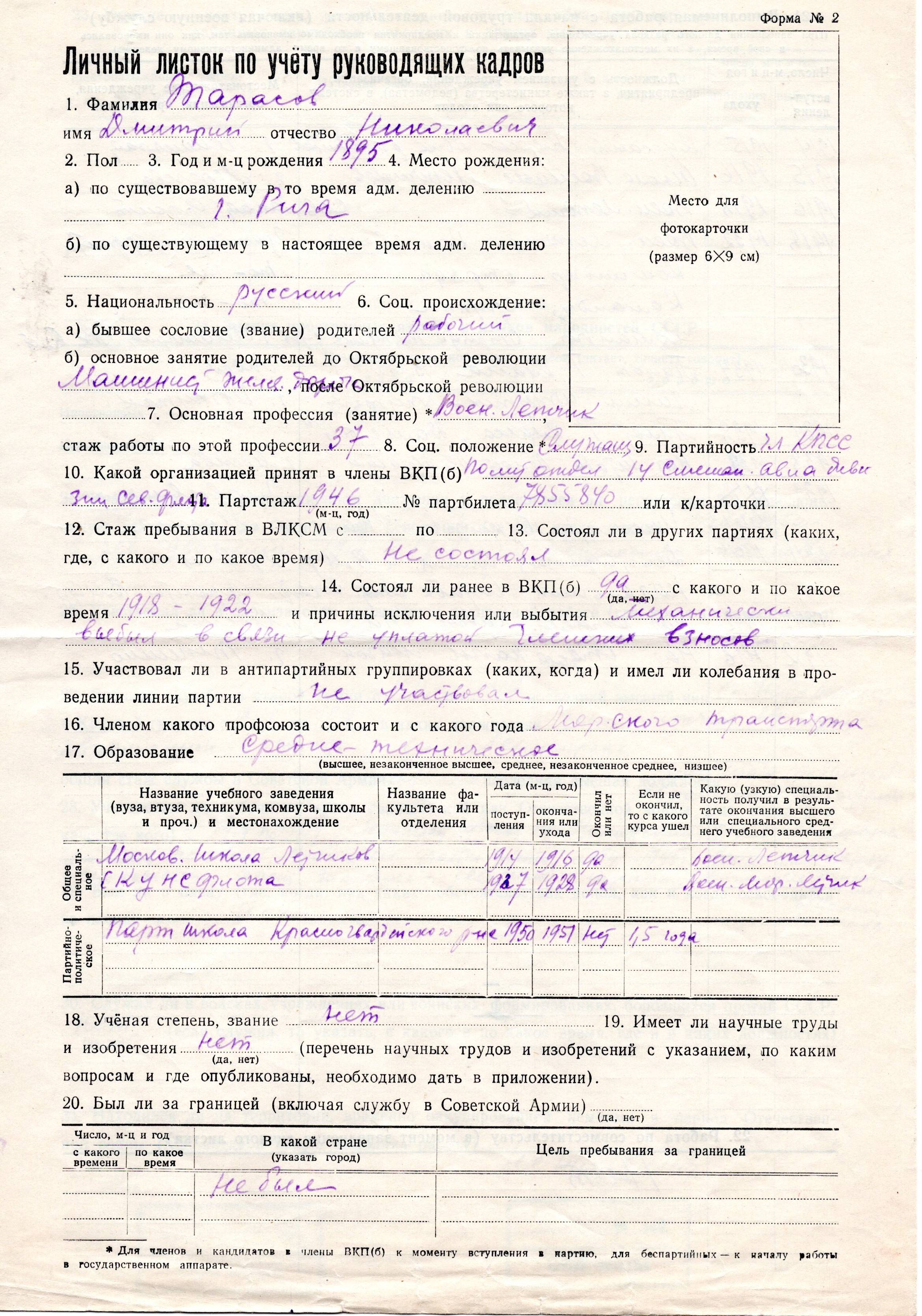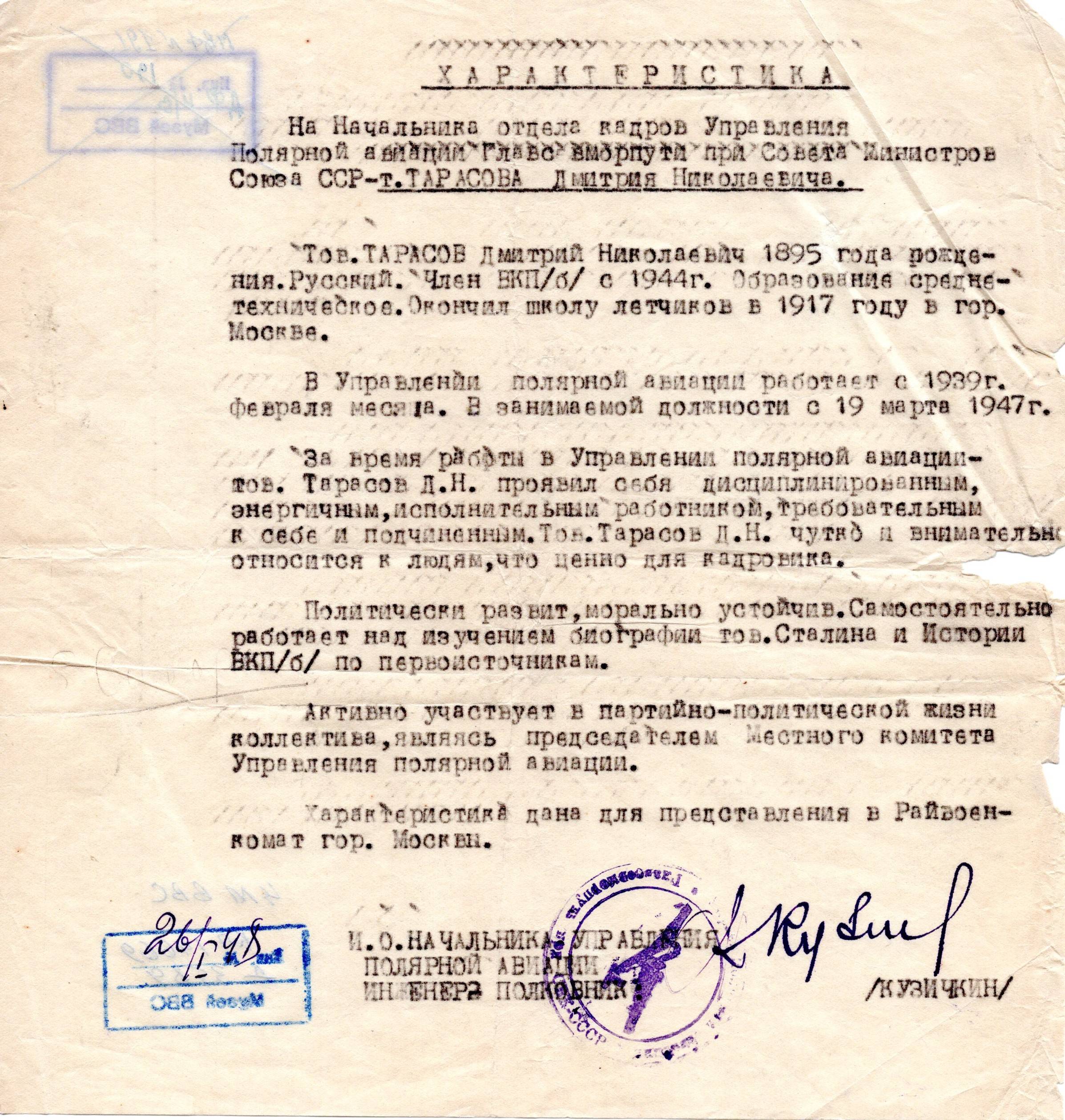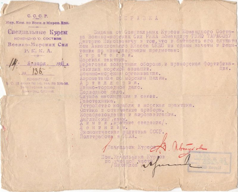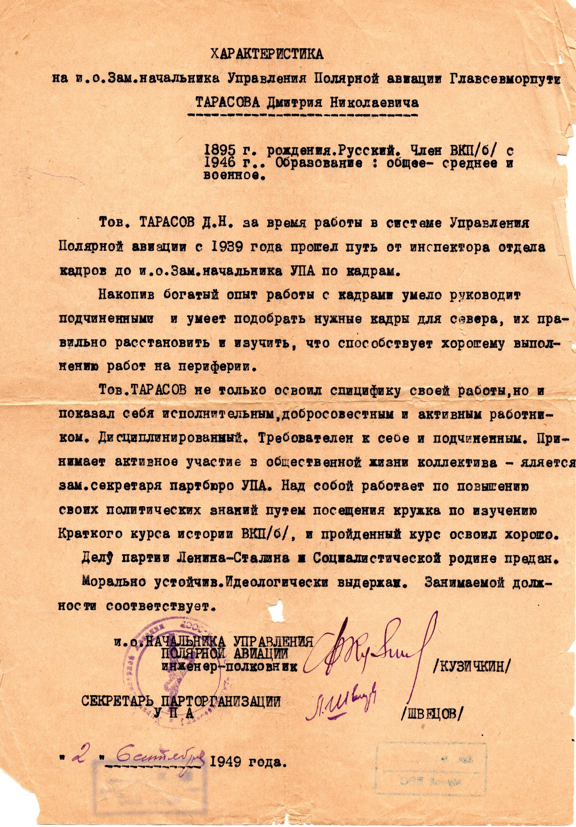 Послужной список командира неотдельного отряда 62-й отдельной авиаэскадрильи майора Тарасова Д.Н., составленный 31 декабря 1929 г.