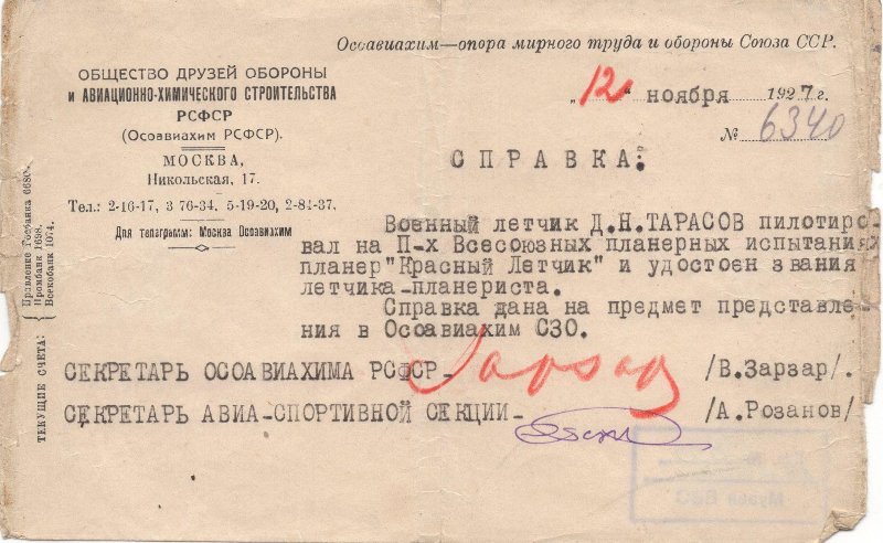 Диплом пилота-авиатора №753 от 16 июня 1918 г., выданный Всероссийским Авиационно-Воздухоплавательным обществом, Всероссийским Аэроклубом, представителем Международной Воздухоплавательной Федерации