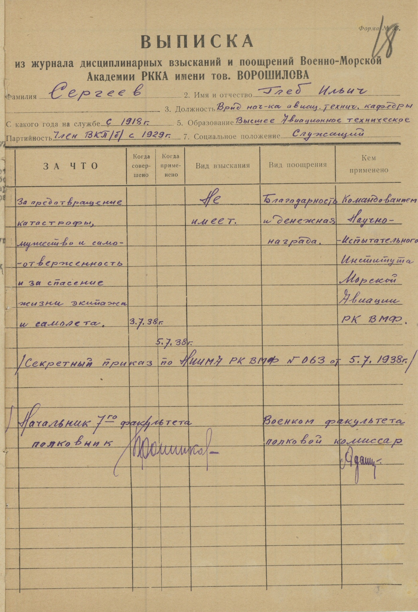 3. В июле 1938 г. командованием Научно-Испытательного Института морской авиации РККФ награжден денежной наградой с вынесением благодарности за проявленные мужество и самоотверженность при поломке конструкции в воздухе, за спасение жизни экипажа и самолета при испытательном полете.