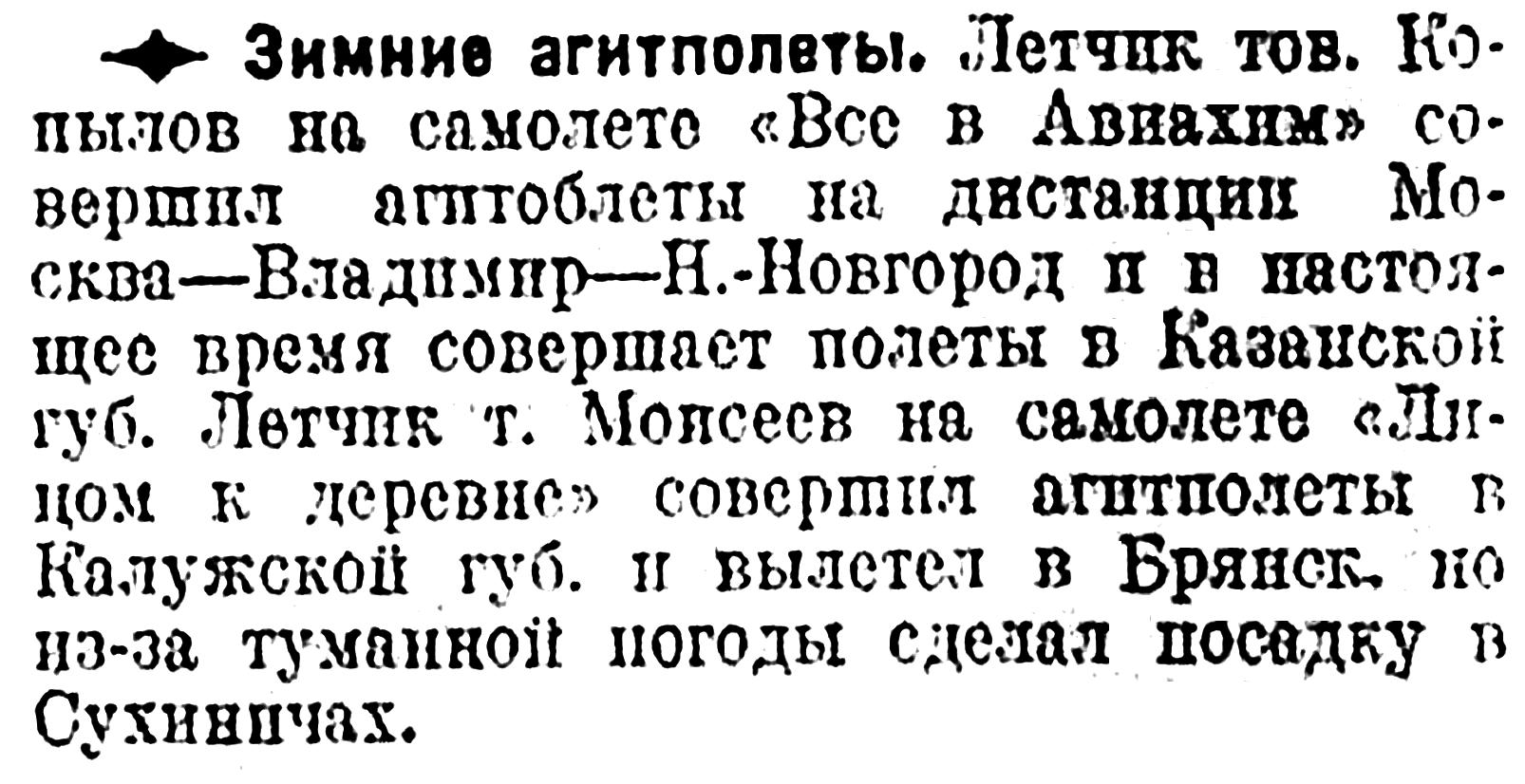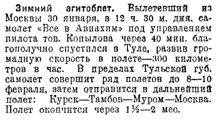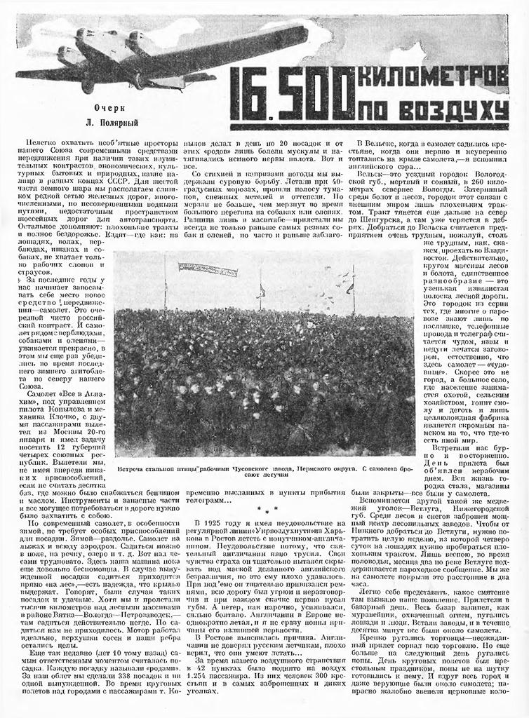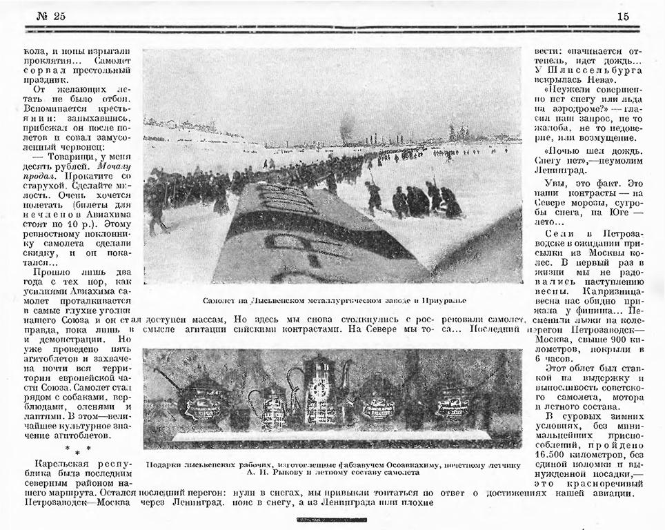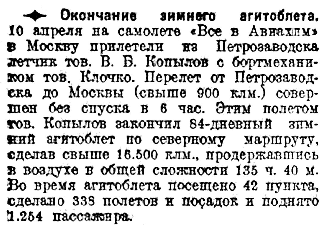 В суровых зимних условиях, без минимальнейших приспособлений, пройдено 16.500 километров, без единой поломки и вынужденной посадки, — это красноречивый ответ о достижениях нашей авиации.