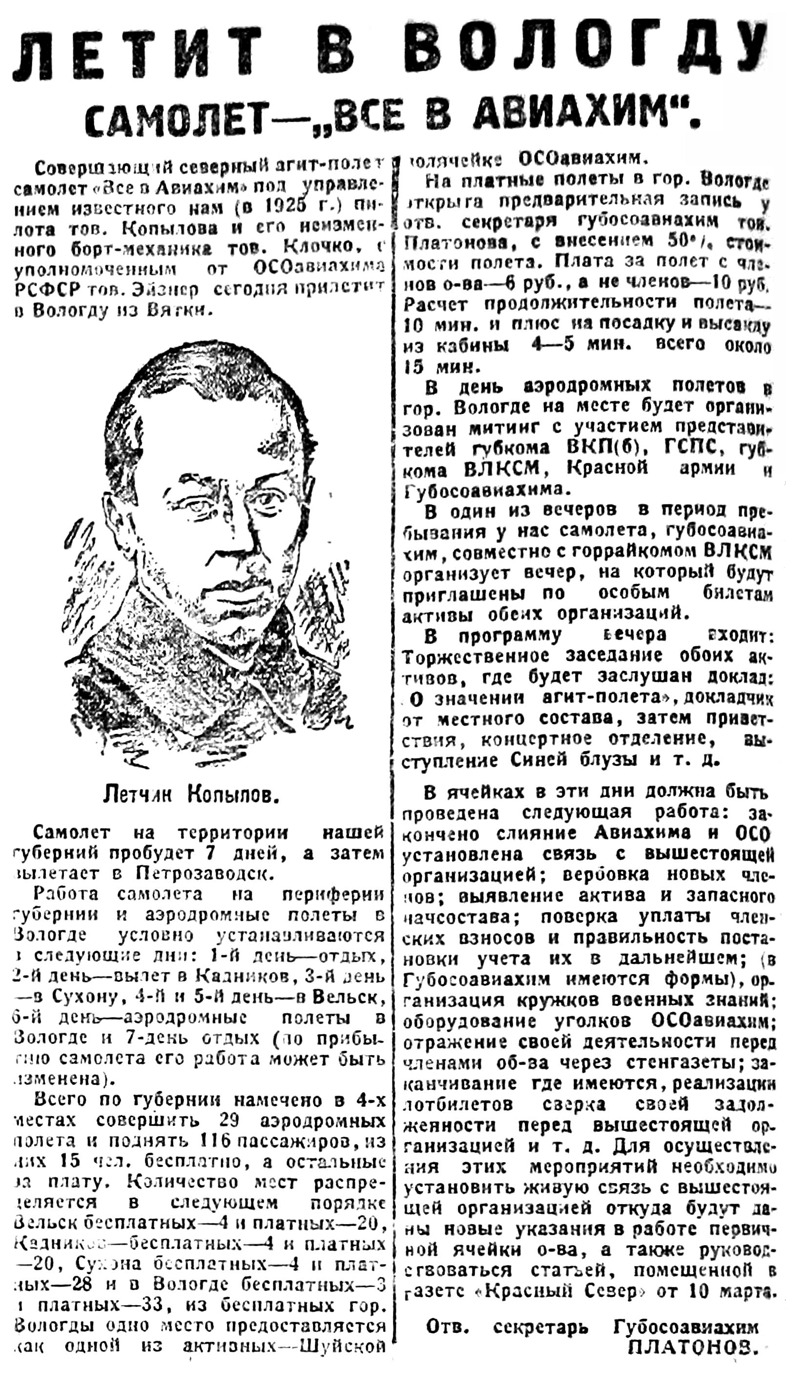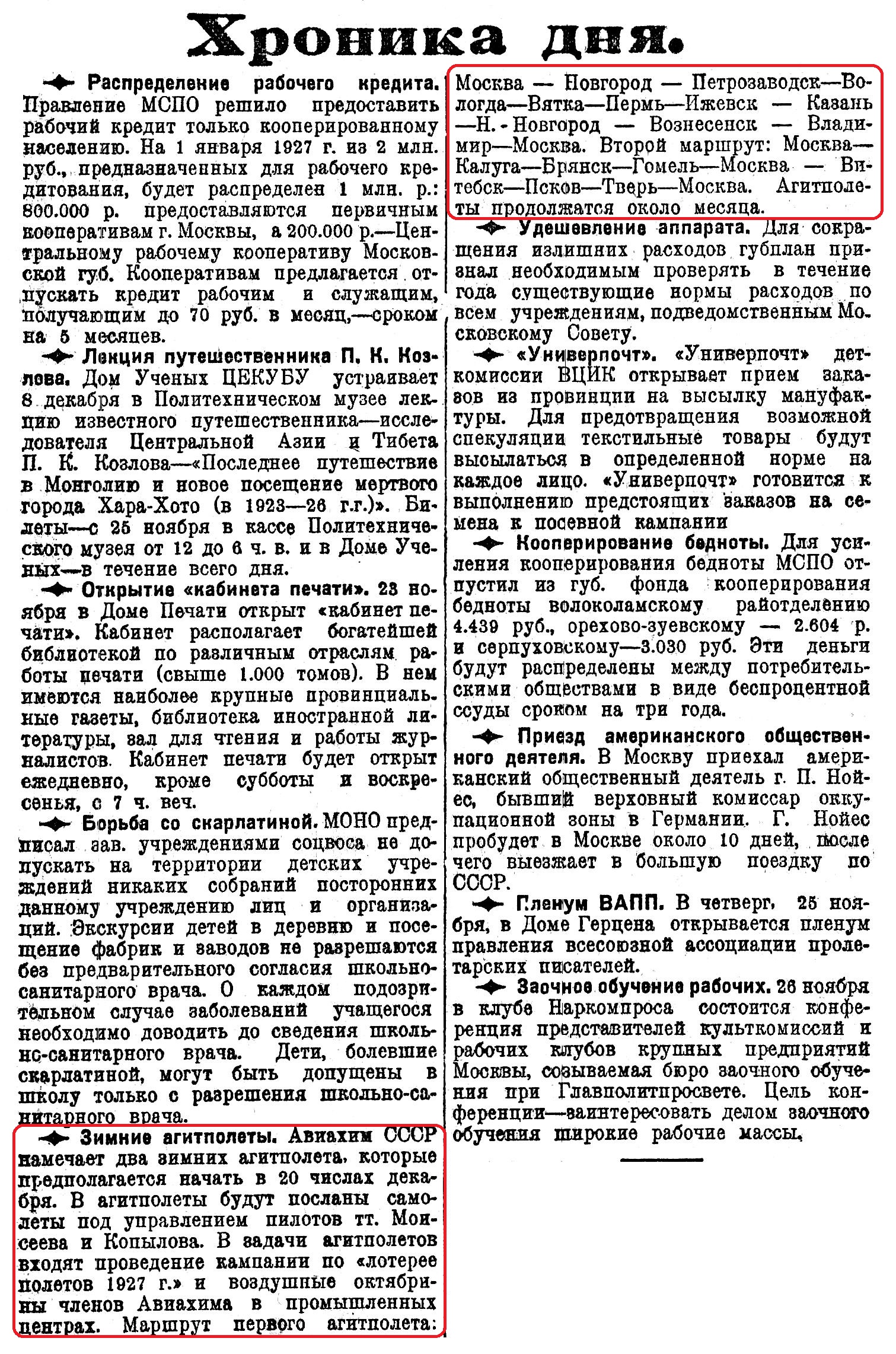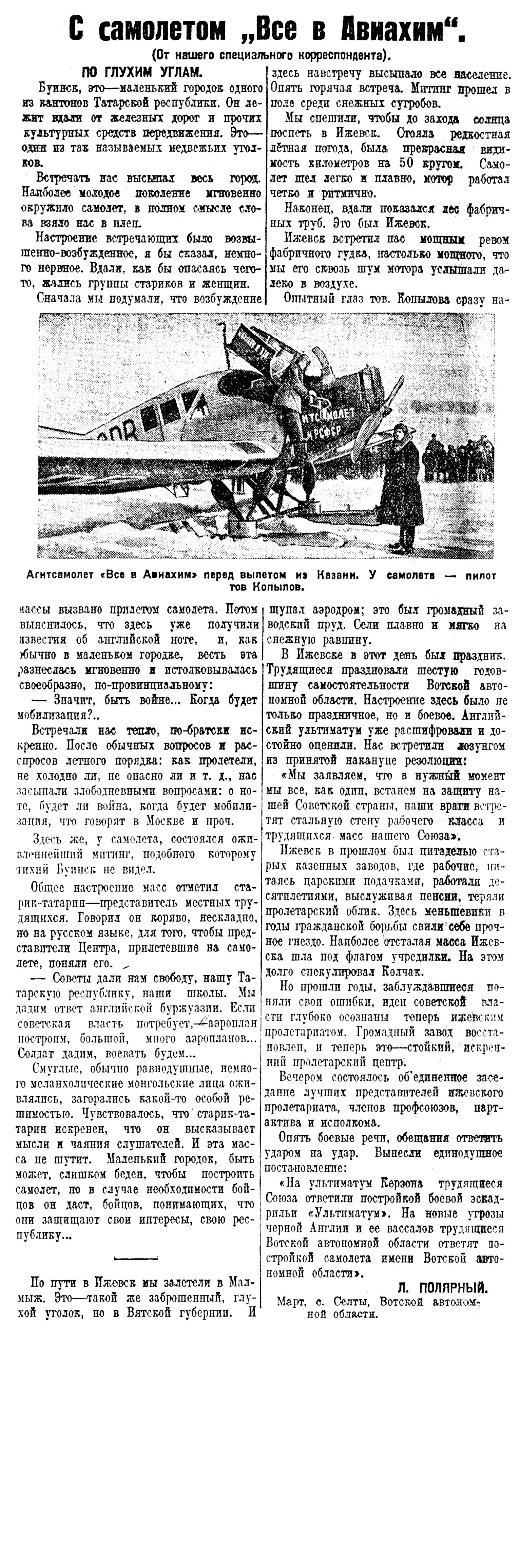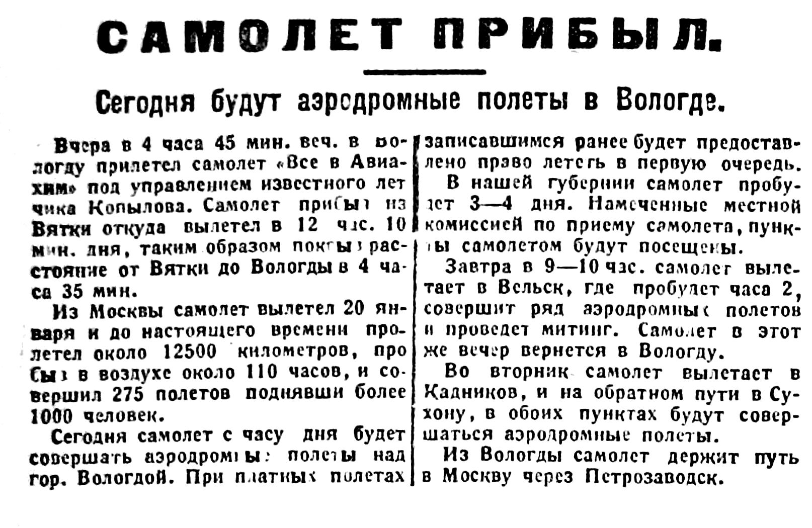 В суровых зимних условиях, без минимальнейших приспособлений, пройдено 16.500 километров, без единой поломки и вынужденной посадки, — это красноречивый ответ о достижениях нашей авиации.