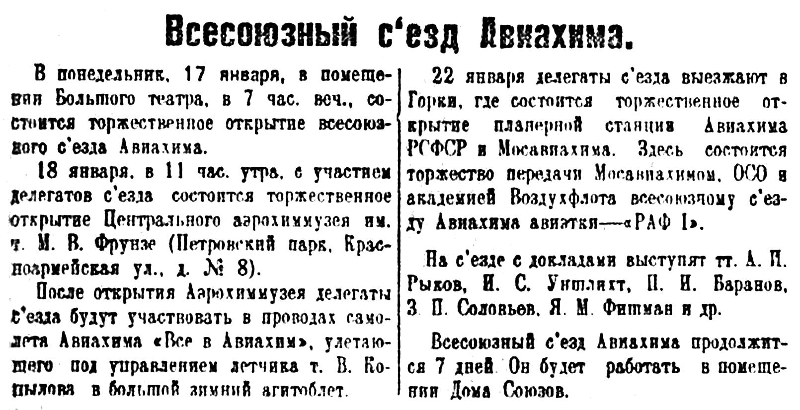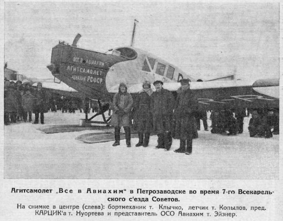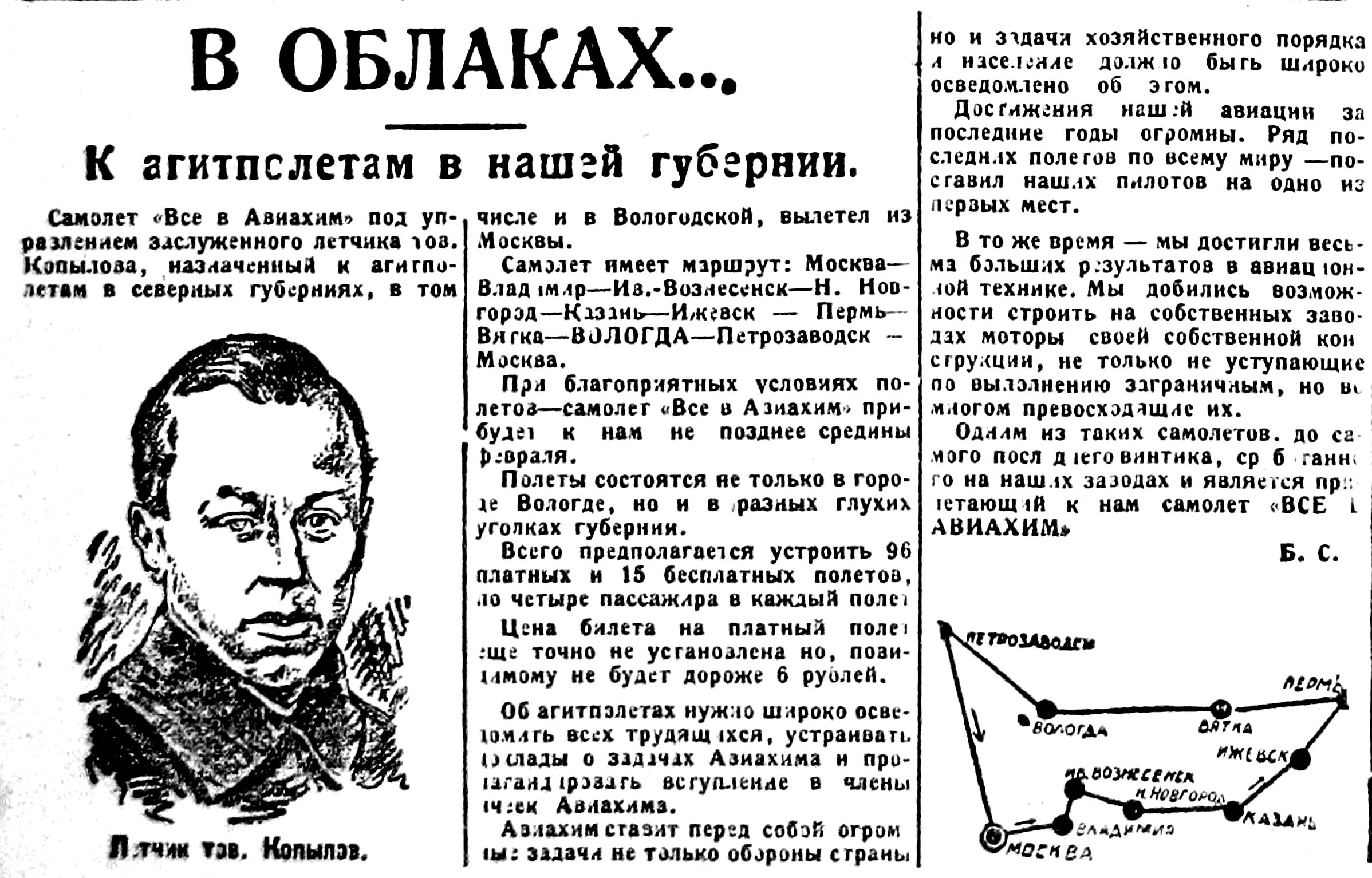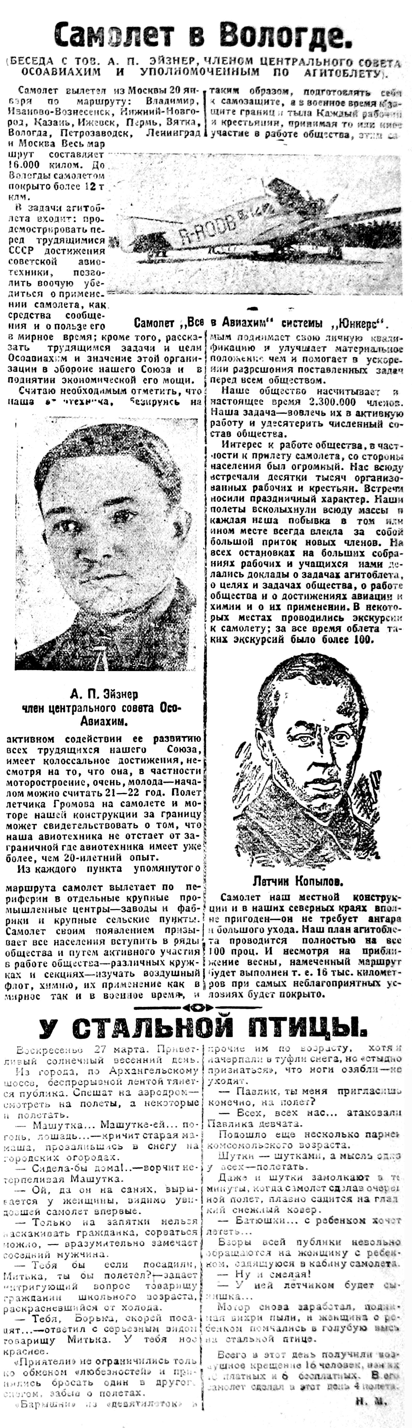 Прошло лишь два года с тех пор, как усилиями Авиахима самолет проталкивается в самые глухие уголки нашего Союза и он стал доступен массам, правда, пока лишь в смысле агитации и демонстрации. Но уже проведено пять агитоблетов и захвачена почти вся территория европейской части Союза. Самолет стал рядом с собаками, верблюдами, оленями и лаптями. В этом — величайшее культурное значение агитоблетов.