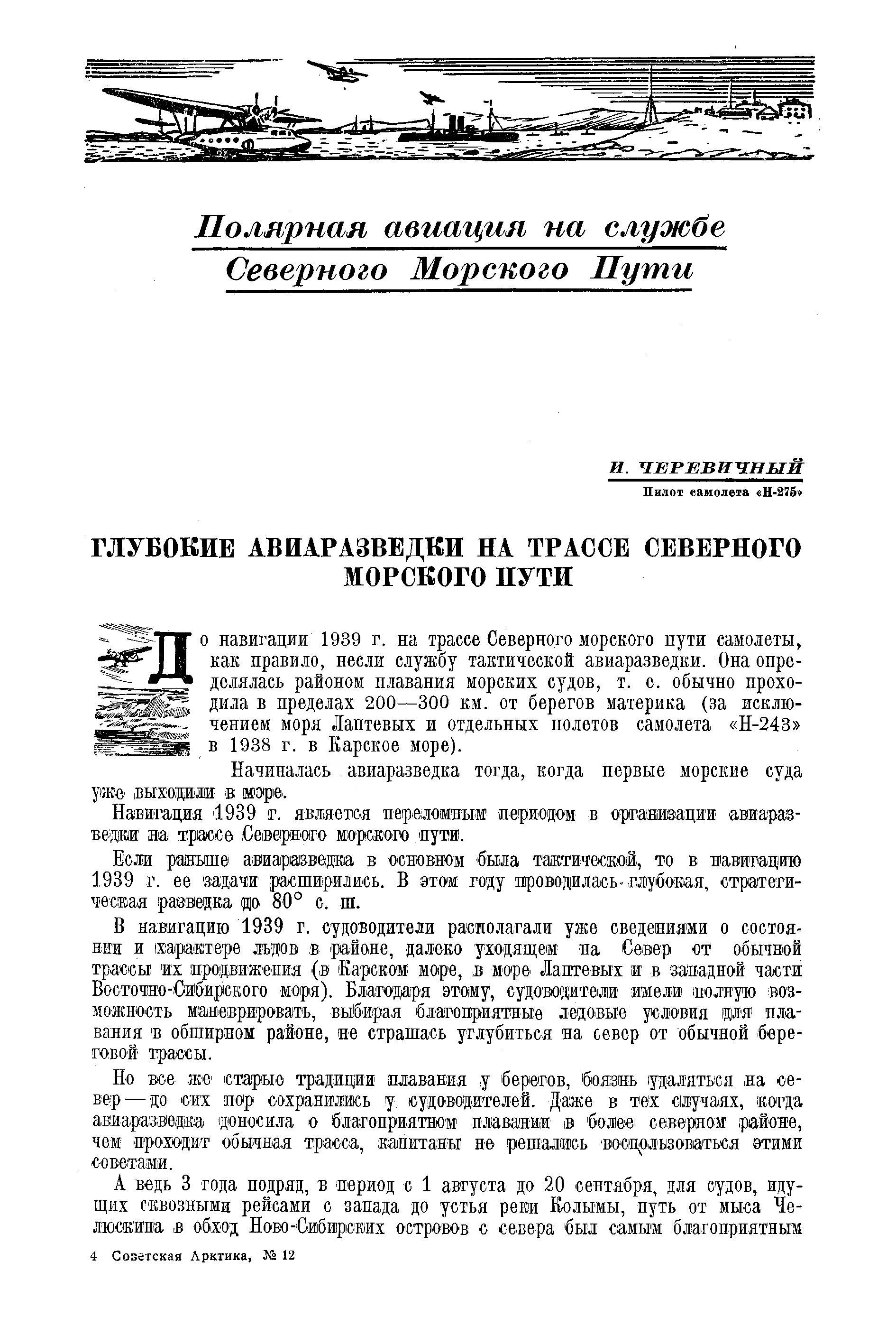 5 марта, в 10 час. 25 мин. утра, с Московского аэродрома улетел в Арктику самолет "СССР-Н-169", пилотируемый одним из старейших и опытнейших полярных пилотов — И. И. Черевичным. В составе экипажа — 2-й пилот т. Каминский, штурман т. Аккуратов, бортмеханики тт. Шекуров, Борукин и Дурманенко и радист т. Макаров. На борт самолета были взяты также научные сотрудники Арктического научно-исследовательского института во главе с директором института т. Либиным. Экипаж самолета должен будет провести глубокую преднавигационную разведку с целью обеспечить полярную навигацию 1941 г.
