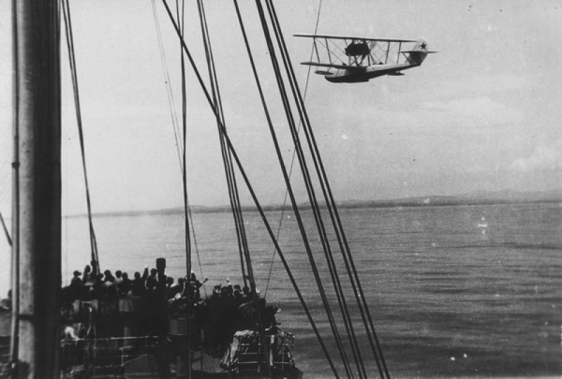 Экспедиция по спасению челюскинцев. Участники с борта парохода «Смоленск» приветствуют пролетающий гидросамолёт. Очевидно, что это и есть «Савойя» С-62 бис А.П.Святогорова. Май 1934 г.