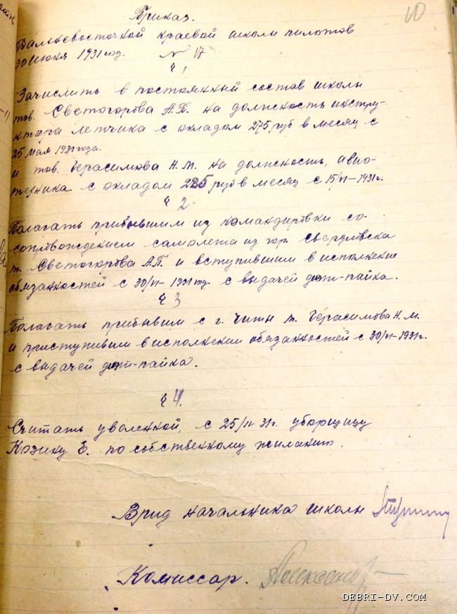 Приказ от 13 июня 1931 г. №17 §1 по Дальневосточной краевой школе пилотов г. Хабаровска: зачислить в постоянный состав школы тов. Светогорова А.П. на должность инструктора летчика с окладом 275 руб. в мес. с 25 мая 1931 г. ГАХК. Ф. Р-1423, Оп. 1, Д. 1, Л. 10.