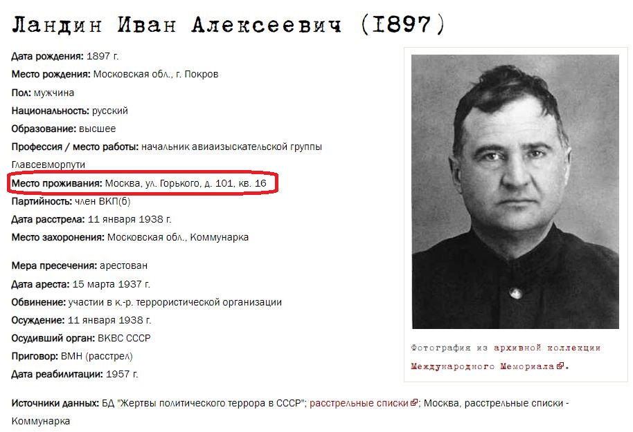 Я "никакой знаток" старой Москвы. Но, судя по адресу, Ландин на момент ареста проживал в некой многоквартирной деревяшке на ул. Горького.