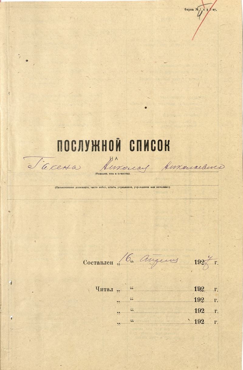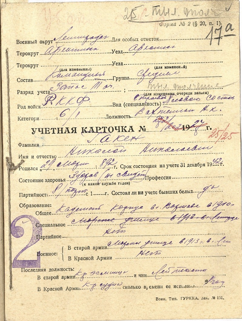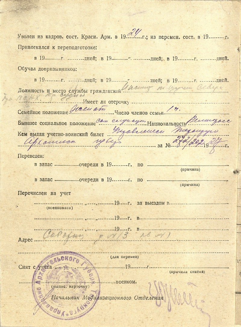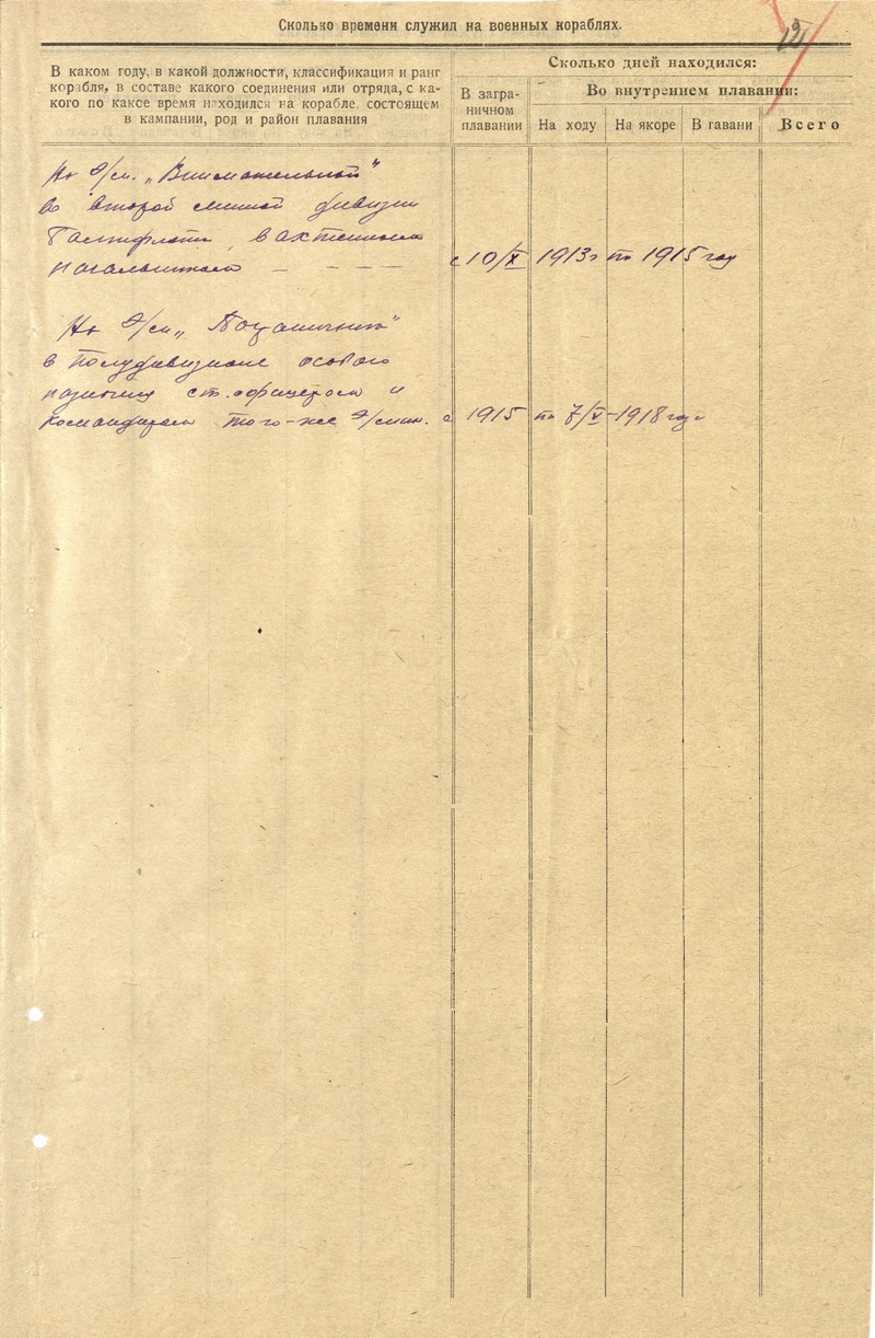 16.04.1927 Комиссией по переучету начсостава запаса при УТО Архангельской губ., признан подлежащим использованию в военное время на должности "вахтенного начальника".