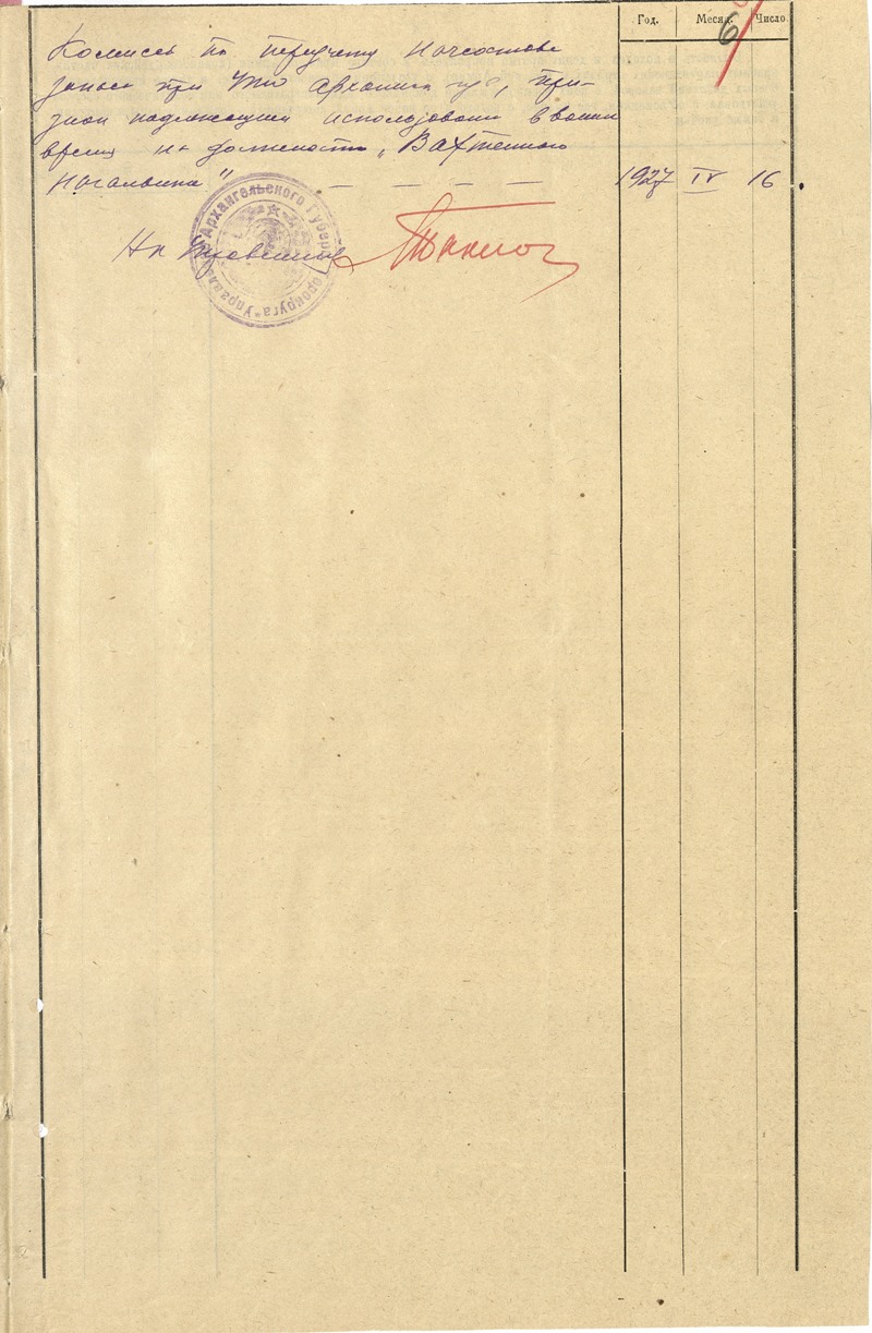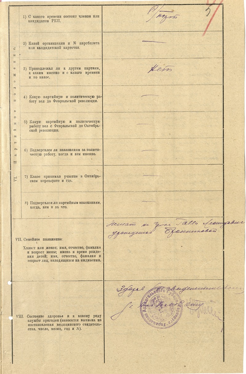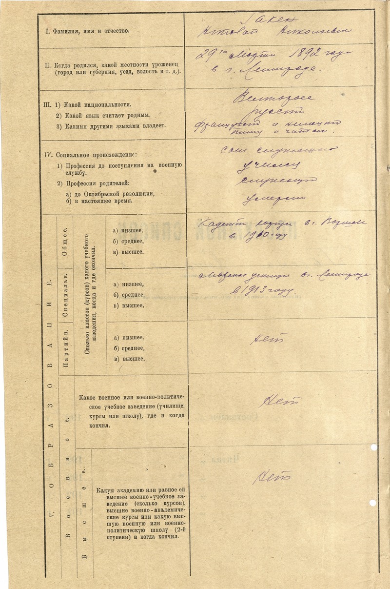 16.04.1927 Комиссией по переучету начсостава запаса при УТО Архангельской губ., признан подлежащим использованию в военное время на должности "вахтенного начальника".
