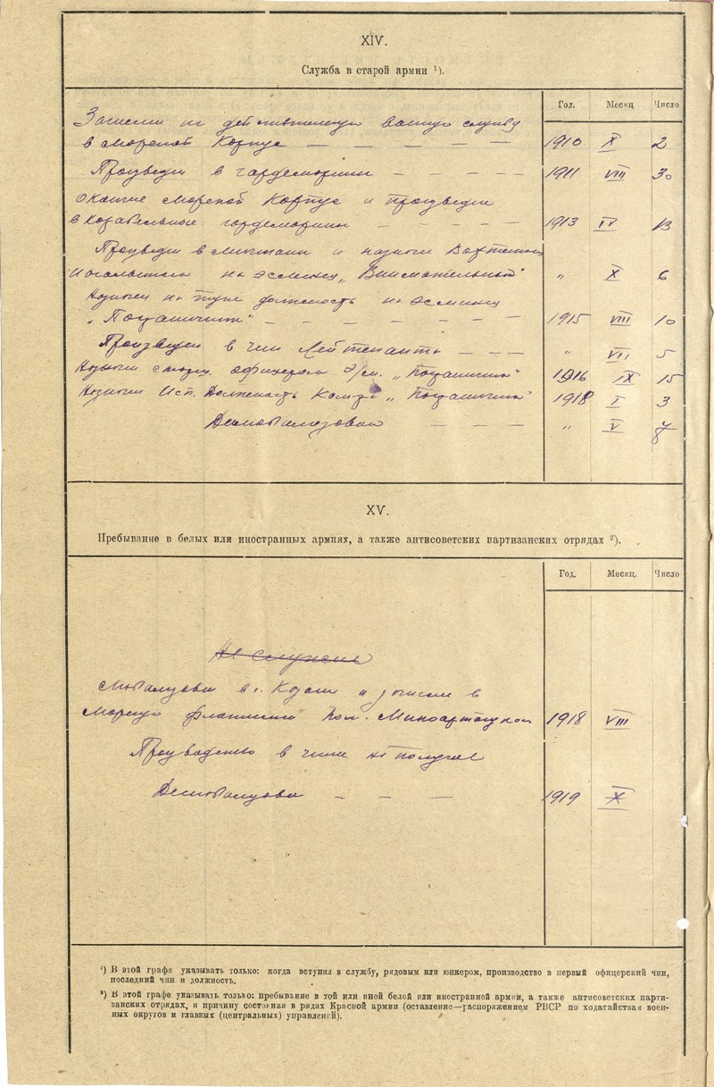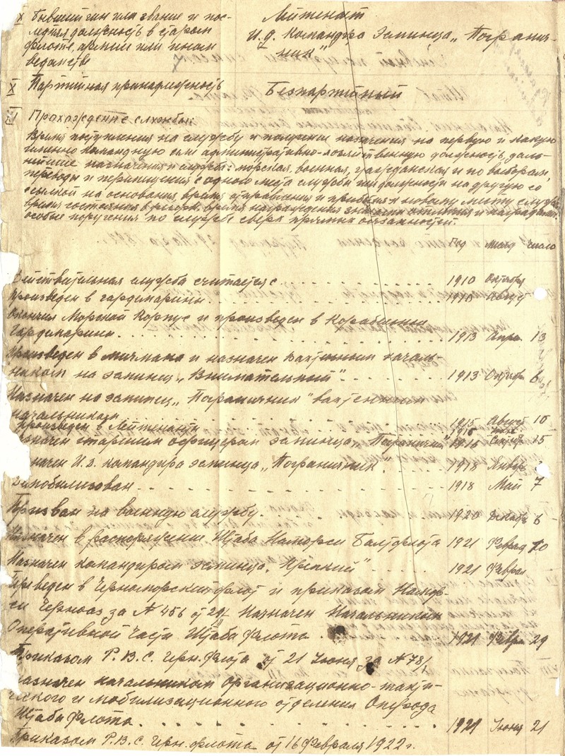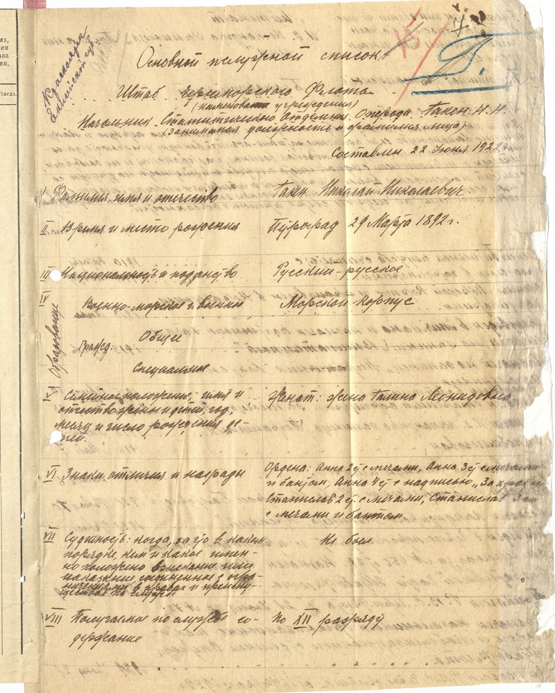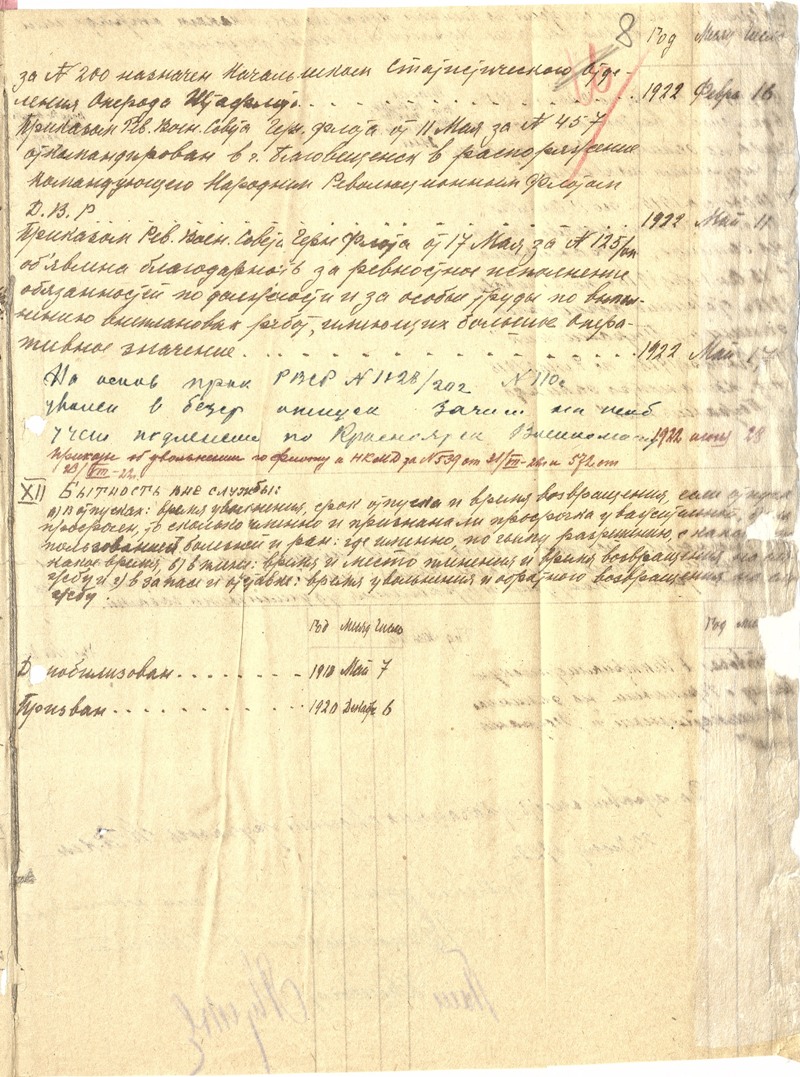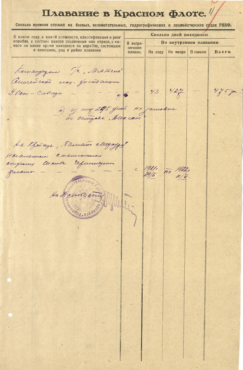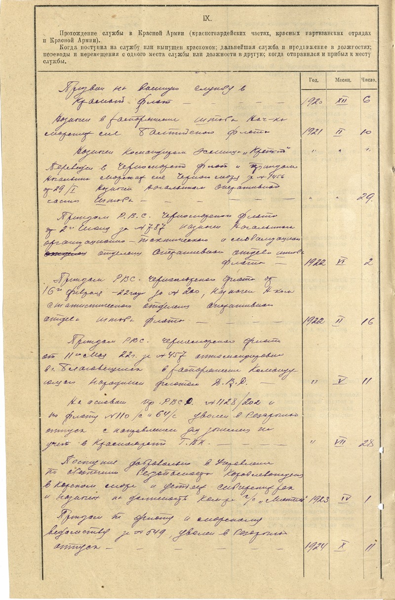 28.07.1922 На основании приказа РВС №1128/202 и по флоту №110/с и 64/с уволен в бессрочный отпуск с направлением для зачисления на учет в Красноярский ГВК.