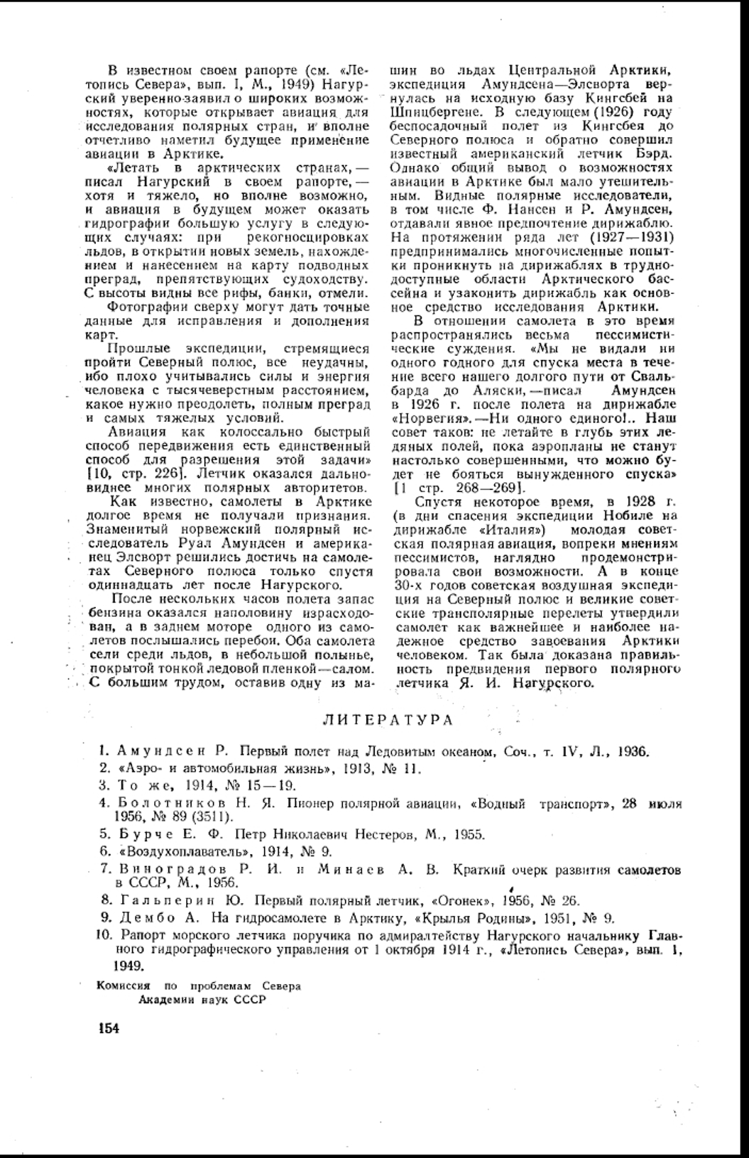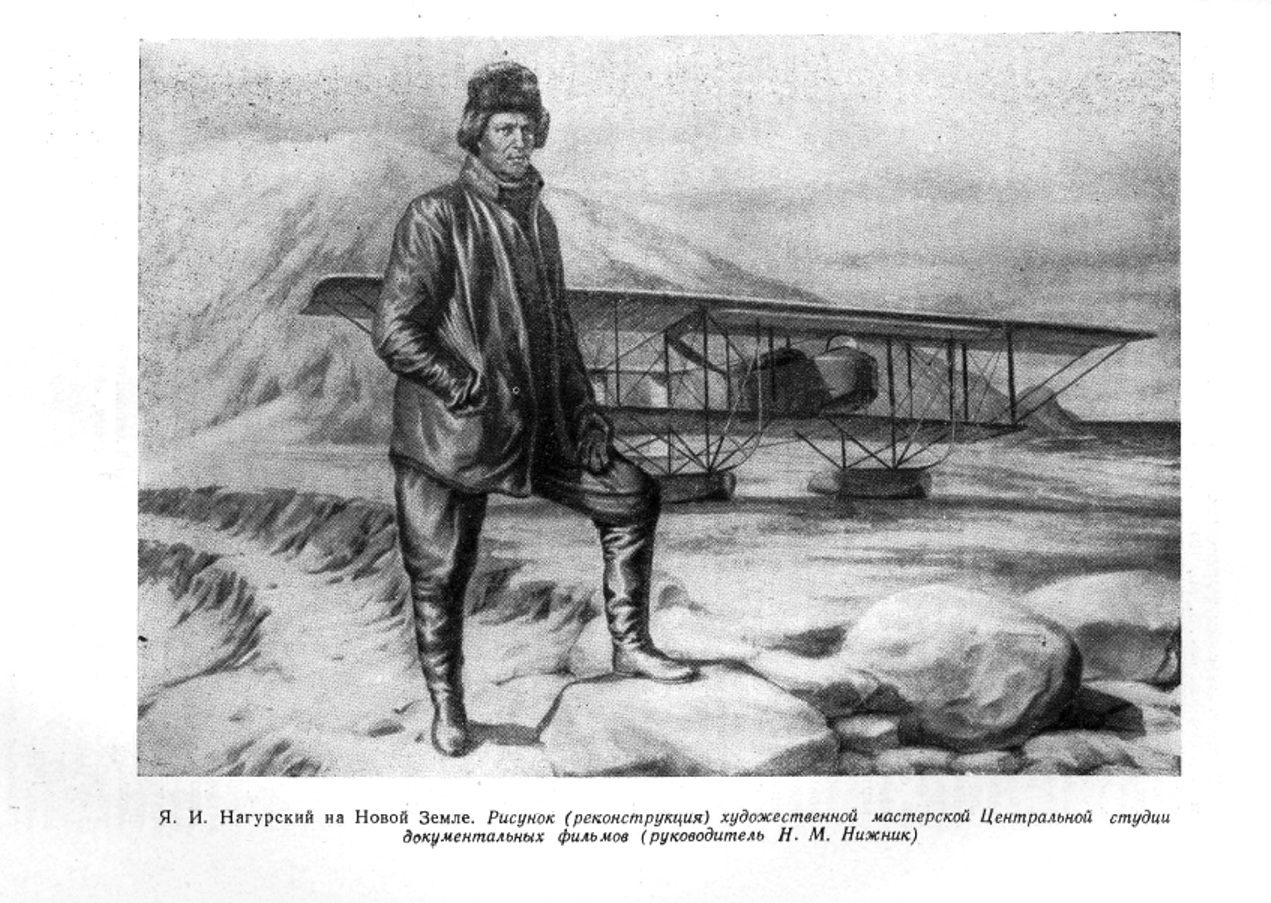 Передо мной лежит двадцать девятый том Энциклопедии. Читаю: «Нагурский Иван Иосифович (1883—1917) — русский военный летчик, совершивший первые полеты в Арктике на самолете. В 1914 году, в поисках русских арктических экспедиций Г. Я. Седова, Г. Л. Брусилова и В. А. Русанова, Нагурский совершил (с Новой Земли) на гидросамолете 5 полетов, во время которых достиг на Севере мыса Литке и удалился к северо-западу на 100 километров от суши. Нагурский находился в воздухе свыше 10 часов и прошел около 1 100 километров на высоте 800—1 200 метров. Нагурский указал на возможность достижения Северного полюса на самолете».