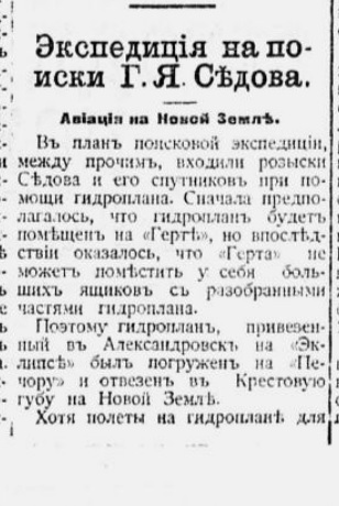 1913 год оказался неблагоприятным для полярных исследований. В этот год не вернулись из Арктики русские экспедиции Русанова и Брусилова. Летом 1914 года на их поиски было отправлено три корабля. В составе одной из экспедиций находился летчик Нагурский с гидросамолетом „Фарман“. На этом самолете Нагурский провел несколько полетов в районе Новой Земли, налетав в общей сложности около десяти часов. Все его полеты, несмотря на весьма неблагоприятные метеорологические условия, закончились благополучно. Самолет выдержал испытание и завоевал всеобщее признание как надежное средство для преодоления огромных расстояний Арктики.