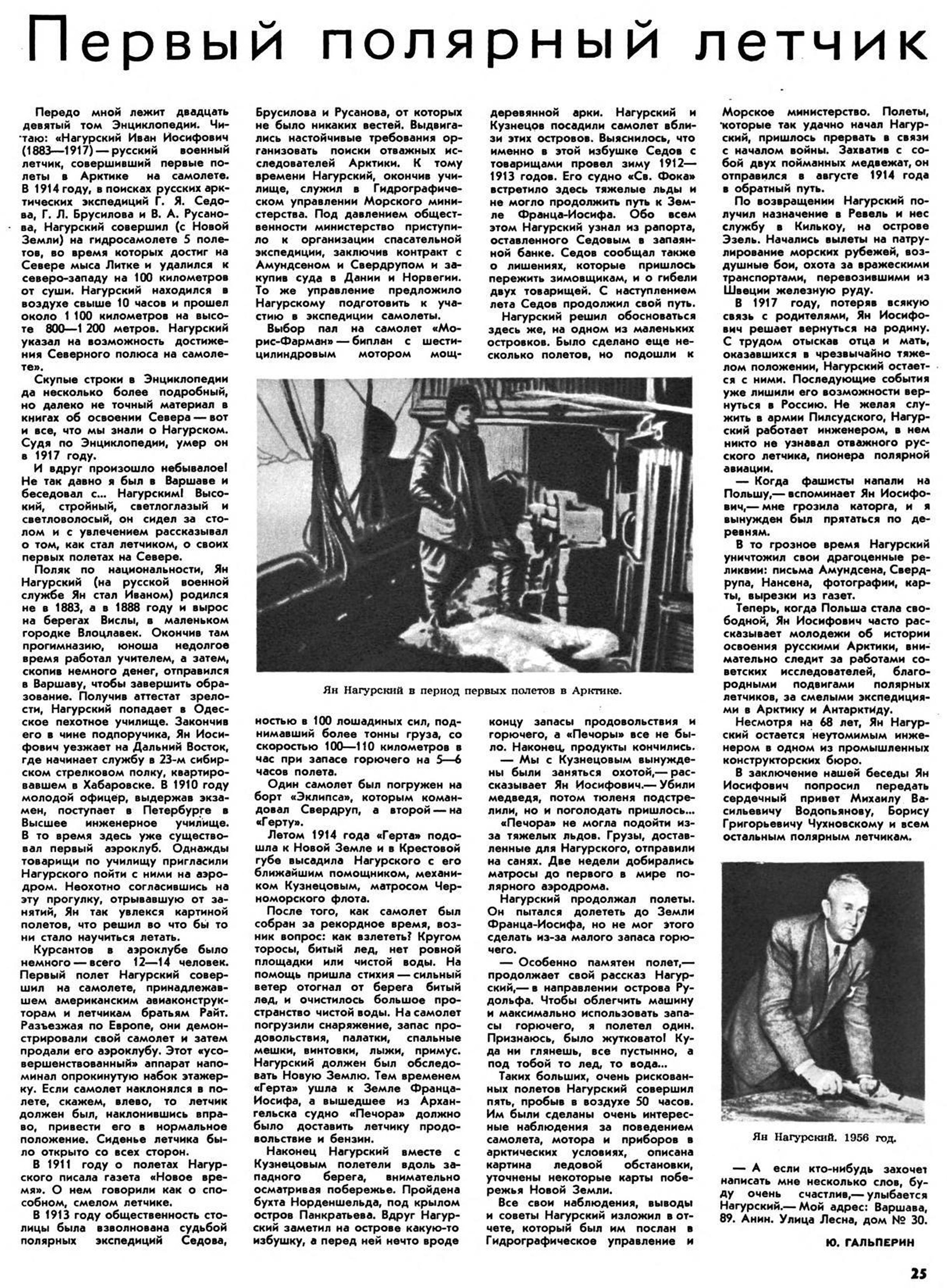 Не зная адреса Нагурского, я послал письмо свое в польское посольство в Москве, сопроводив его прось­бой разыскать в Варшаве Нагурского и передать ему мое письмо. Спустя месяц я получил от Яна Иосифовича ответное письмо и его домашний адрес. Завязалась пе­реписка, и Ян Иосифович прислал мне в подарок свою книжку на русском языке, а также свою фотографию и подробное описание одного из памятных ему и еще нигде не описанного полета на поиски пропавших экспе­диций Г. Седова, Г. Брусилова и В. Русанова.