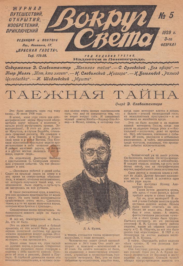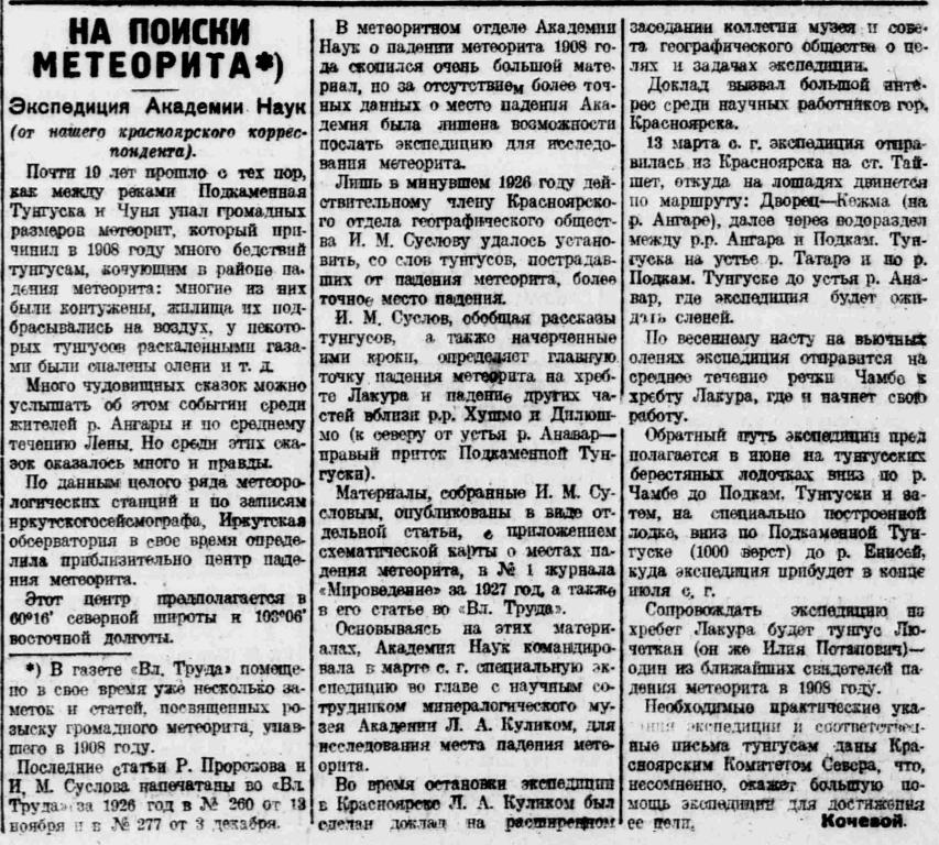 "Заведующий крайлесотделом Собакин, производивший разведки в районе Подкаменной Тунгуски, двадцать пять дней назад встретил таксатора партии, Новикова, который передал, что видел в Тайге рабочего Кулика. Рабочий ушел от ученого вследствие гнетущей обстановки. Кулик остался один в своей избушке. Ему угрожают бандиты. Из ангарских селений убежало пять ссыльных уголовных, которые оперируют в верховьях Подкаменной Тунгуски. Грабят тунгусов, заставляют крестьян выпекать себе хлеб, расспрашивают, как пробраться к избушке Кулика. Бандиты предполагают, что ученый ищет в земле золото. В тайге может разыграться жуткая драма"...