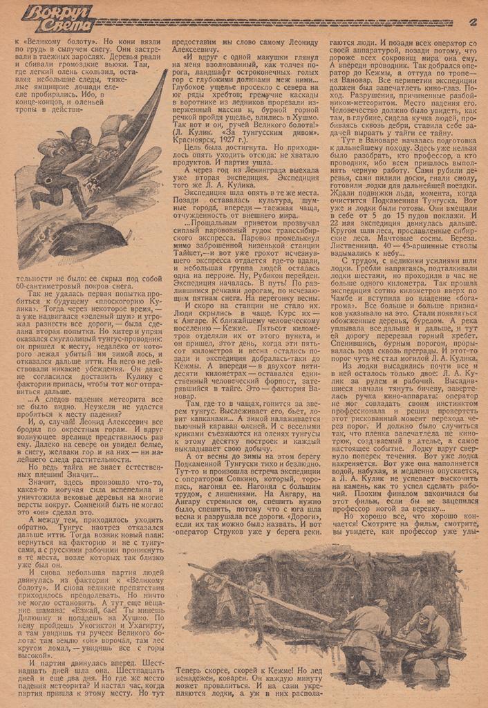 О Кулике здесь рассказывают то же, что мы слышали от Кулакова, но в Кежме Кулика никто не видел. По словам кежмарей, Кулик, расставшись с Сытиным на фактории Ановар, нанял там одного рабочего и с ним отправился к месту падения метеорита. По дороге рабочий умер, и, похоронив