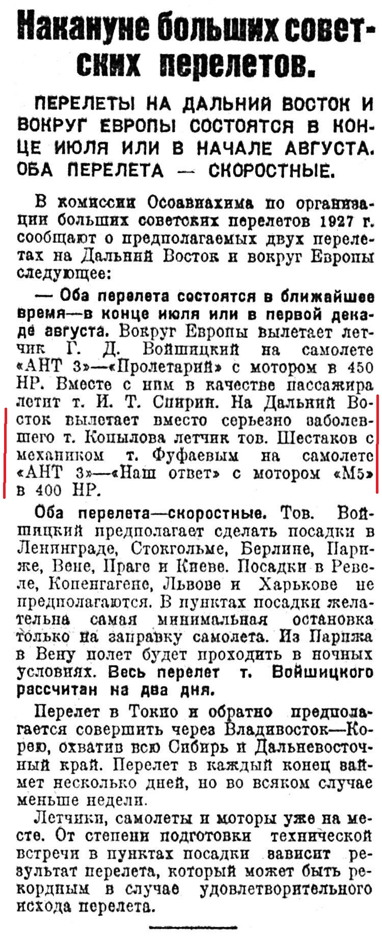 На Дальний Восток вылетает вместо серьезно заболевшего т. Копылова летчик тов. Шестаков с механиком т. Фуфаевым на самолете «АНТ 3» — «Наш ответ» с мотором «М5» в 400 НР.