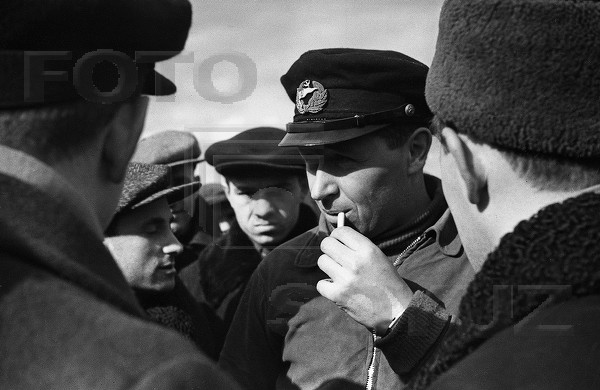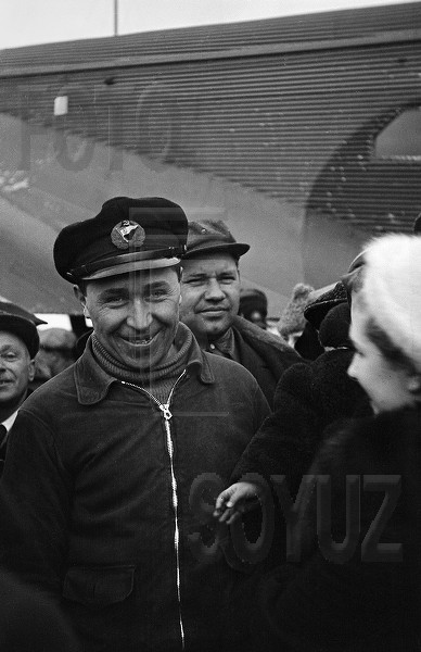 Встреча полярных летчиков И.П.Мазурука и Ф.Б.Фариха, участвовавших в высадке первой дрейфующей научной станции "Северный полюс-1". Илья Мазурук (слева).