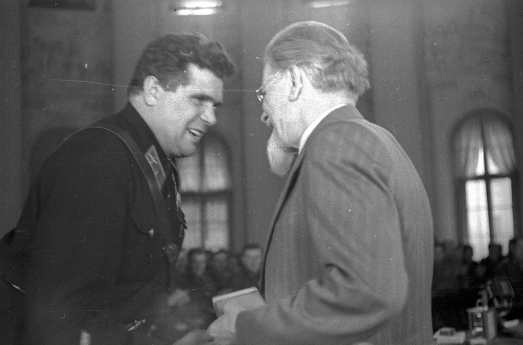 М.И.Калинин (справа) вручает М.В.Водопьянову орден Красного Знамени за участие в советско-финляндской войне. Москва, Кремль, 1940 г.