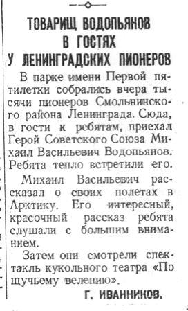 ИВАННИКОВ Г.ТОВАРИЩ ВОДОПЬЯНОВ В ГОСТЯХ У ЛЕНИНГРАДСКИХ ПИОНЕРОВ//Пионерская правда 28 июня_1939№ 87 (2257)