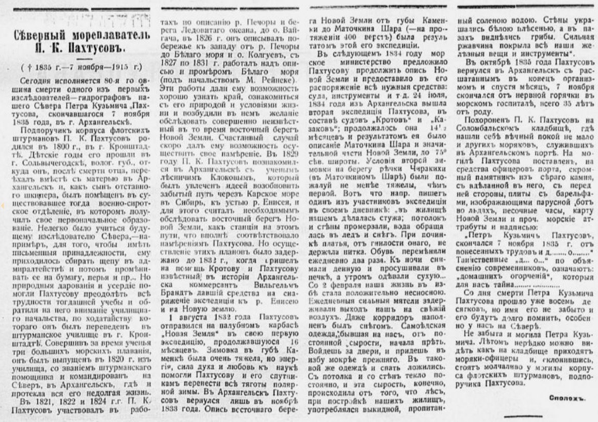 19 ноября 1935 г. исполнилось сто лет со дня смерти выдающегося русского исследователя Севера П. К. Пахтусова, получившего особенную известность своими работами на Новой Земле.