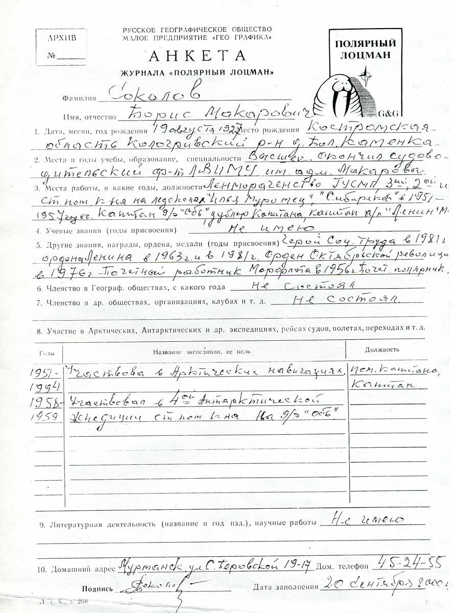 Осенью первого послевоенного года вслед за двумя дружками выпускник кологривской средней школы Борис Соколов приехал в Ленинград. Друзья поступили в медицинский институт, призывали последовать их примеру и Бориса, но его привлекало море. Как ни старались друзья, Соколов стоял на своем: высшее военно-морское училище или арктическое.