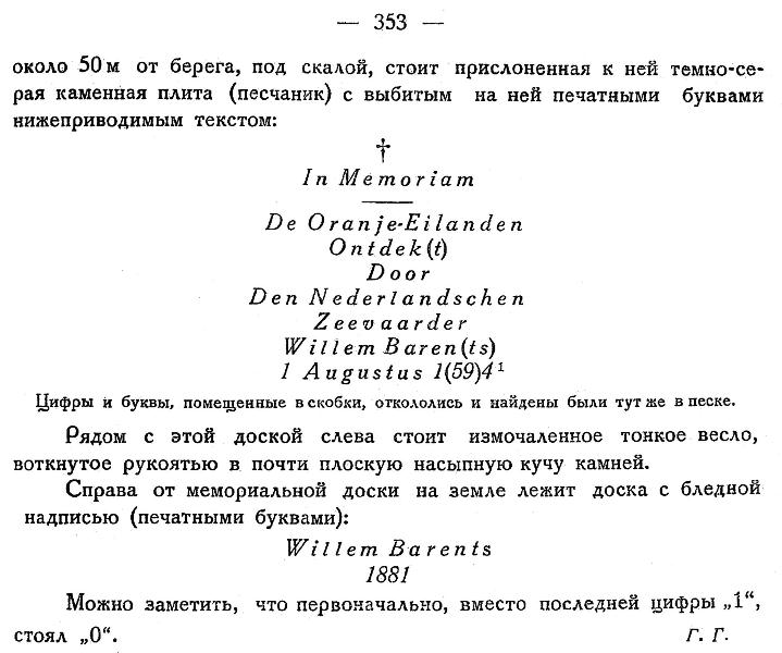 {1} Обнаруженная Г. В. Горбацким на Оранских о-вах памятная доска в честь открывшего эти острова Виллема Баренца была поставлена в 1881 г. голландской экспедицией на судне „Willem Barents", под начальством К. ван Брекхейзена (Н. van Вгоеkhuizеn). Найденная туг же куча камней представляет собою гурий, сложенный той же экспедицией. Согласно описанию экспедиции „Willem Barents" в 1881 г. (Verslagen omtrent den vierden tocht van de Willem Barents naar de Ijszee in den zomer van 1881. Haarlem, 1882), в этот гурий было вложено письменное донесение.