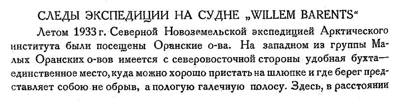 {1} Обнаруженная Г. В. Горбацким на Оранских о-вах памятная доска в честь открывшего эти острова Виллема Баренца была поставлена в 1881 г. голландской экспедицией на судне „Willem Barents", под начальством К. ван Брекхейзена (Н. van Вгоеkhuizеn). Найденная туг же куча камней представляет собою гурий, сложенный той же экспедицией. Согласно описанию экспедиции „Willem Barents" в 1881 г. (Verslagen omtrent den vierden tocht van de Willem Barents naar de Ijszee in den zomer van 1881. Haarlem, 1882), в этот гурий было вложено письменное донесение.