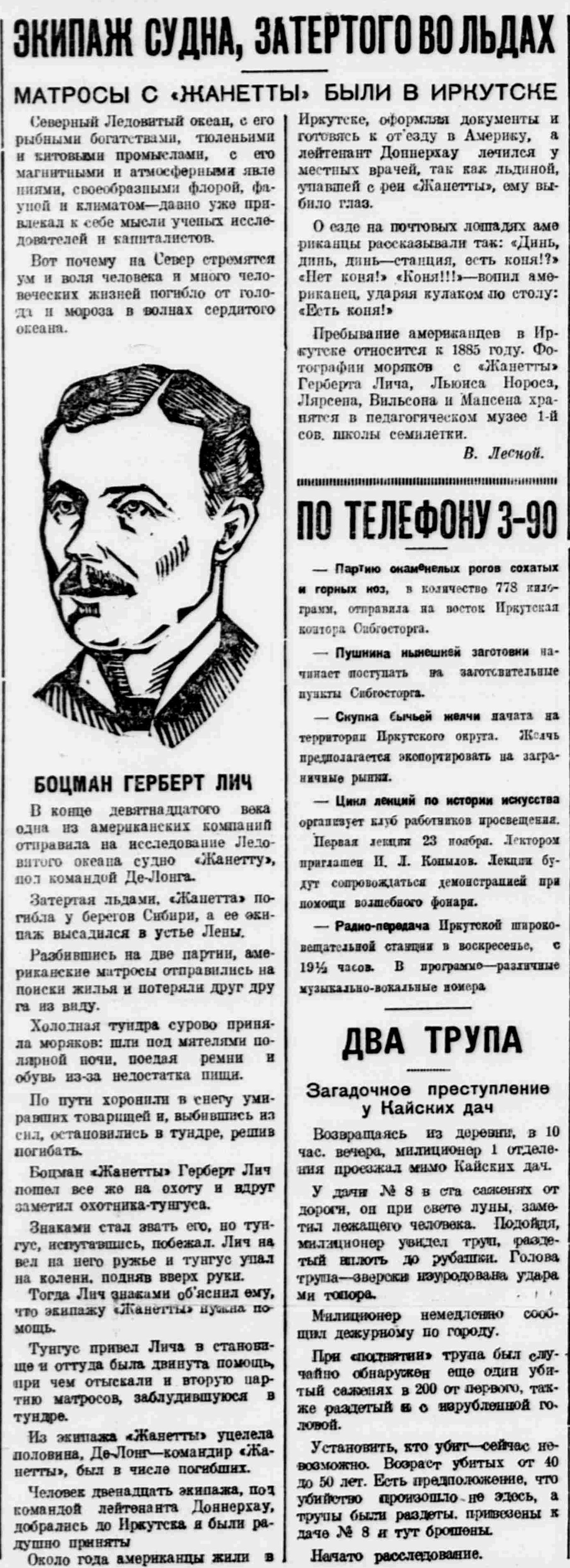Пребывание американцев в Иркутске относится к 1885 году. Фотографии моряков с «Жанетты» Герберта Лича, Льюиса Нороса, Лярсена, Вильсона и Майсена хранятся в педагогическом музее 1-й сов. школы семилетки.