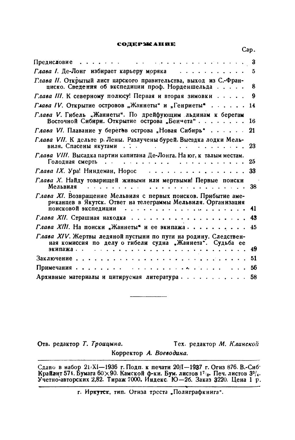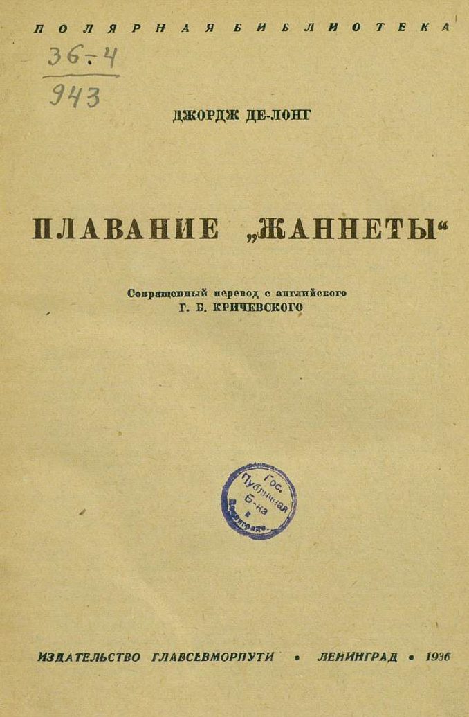 Делонг, Джордж Вашингтон. Плавание «Жаннеты» / Сокр. пер. с англ. Г. Б. Кричевского; — Ленинград: Изд-во Главсевморпути, 1936. — 457, [2] с. — (Полярная библиотека).