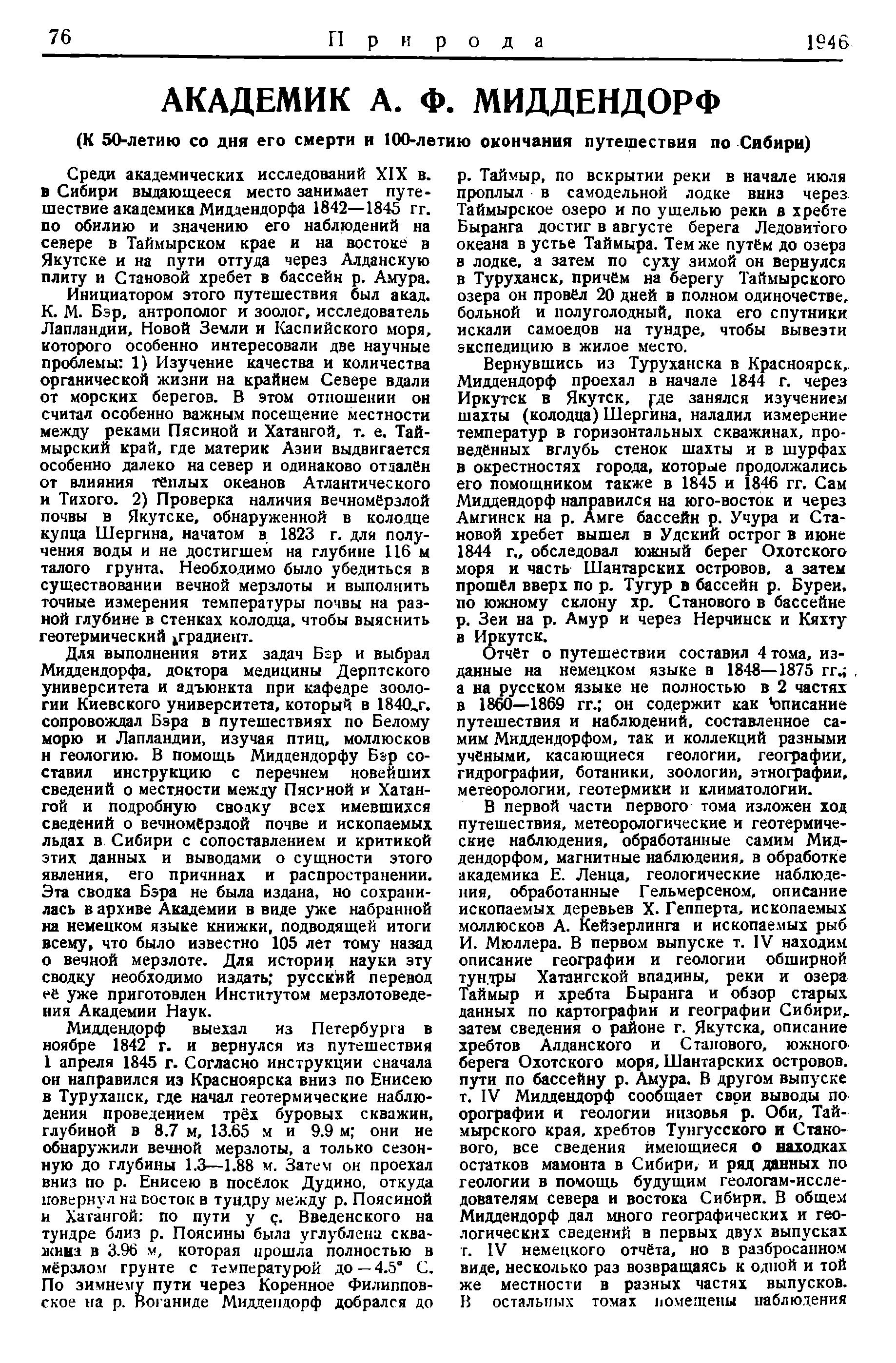 Для выполнения этих задач Бзр и выбрал Миддендорфа, доктора медицины Дерптского университета и адъюнкта при кафедре зоологии Киевского университета, который в 1840 г. сопровождал Бэра в путешествиях по Белому морю и Лапландии, изучая птиц, моллюсков н геологию. В помощь Миддендорфу Бзр составил инструкцию с перечнем новейших сведений о местности между Пясиной и Хатангой и подробную сводку всех имевшихся сведений о вечномерзлой почве и ископаемых льдах в Сибири с сопоставлением и критикой этих данных и выводами о сущности этого явления, его причинах и распространении. Эта сводка Бэра не была издана, но сохранилась в архиве Академии в виде уже набранной на немецком языке книжки, подводящей итоги всему, что было известно 105 лет тому назад о вечной мерзлоте. Для истории науки эту сводку необходимо издать; русский перевод её уже приготовлен Институтом мерзлотоведе-ния Академии Наук.