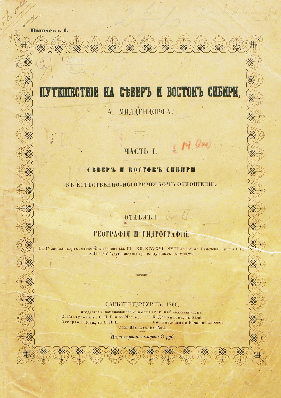 Среди академических исследований XIX в. в Сибири выдающееся место занимает путешествие академика Миддендорфа 1842—1845 гг. по обилию и значению его наблюдений на севере в Таймырском крае и на востоке в Якутске и на пути оттуда через Алданскую плиту и Становой хребет в бассейн р. Амура.