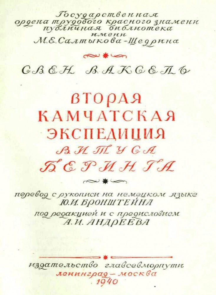 Ваксель Свен. Вторая Камчатская экспедиция Витуса Беринга / Пер. с рук. на нем. яз. Ю. И. Бронштейна. Под ред. с пред. А. И. Андреева. – М.: Главсевморпуть, 1940. – 176 с.