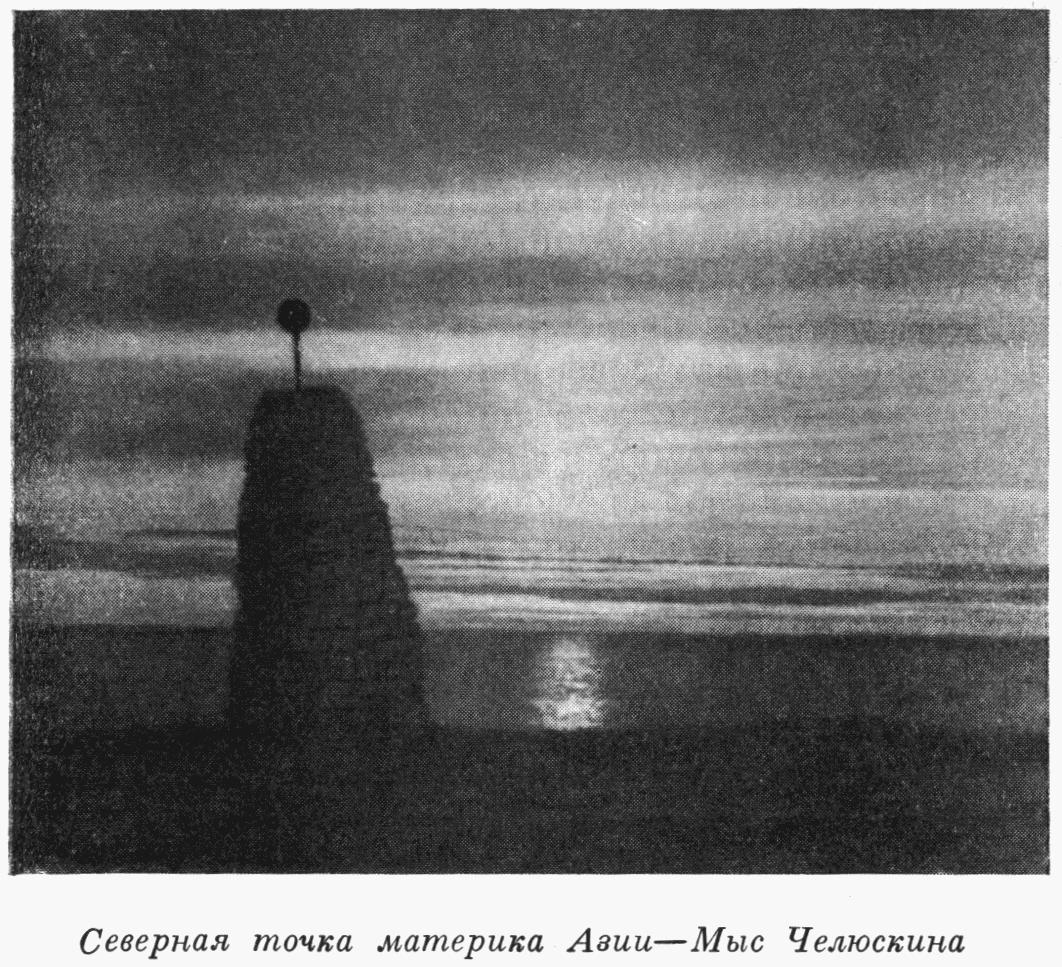 С нынешнего года мыс Челюскина перестанет быть экзотическим: на нем появится жилье, появится людный поселок. Последним напоминанием о былом одиночестве мыса будет служить вот этот гурий, сложенный из шифера и увенчанный позеленевшим медным шаром. Этот гурий поставила норвежская экспедиция, возглавлявшаяся Г. Свердрупом. Повидимому, к тому времени обвалился знак, поставленный значительно ранее экспедицией нашей Академии наук на шхуне «Заря», и вместо него несколько лет стоит знак шхуны «Мод». Медный шар служит для хранения почты, которую каждая экспедиция, побывавшая здесь, оставляет в назидание потомкам и к сведению последующих экспедиций.